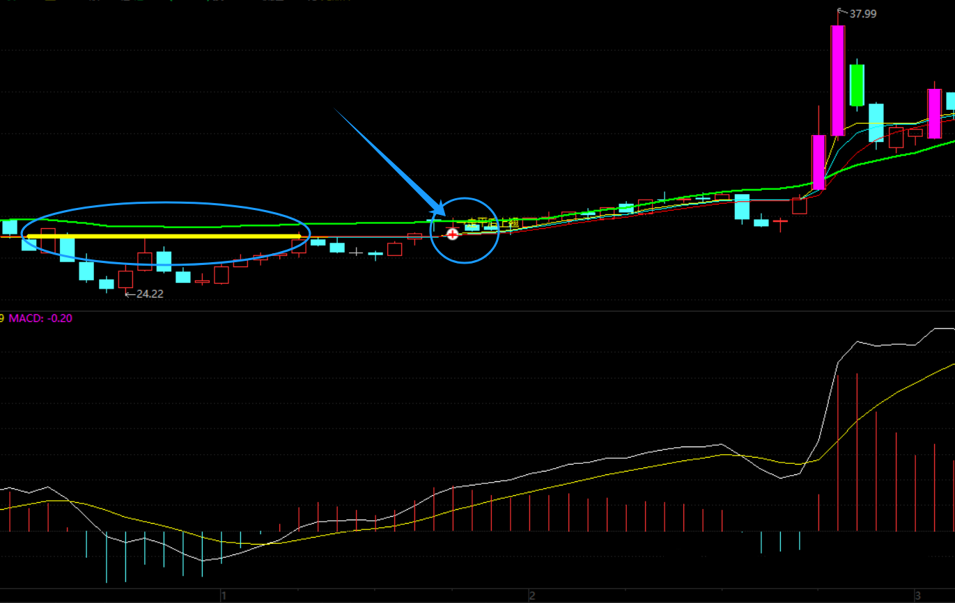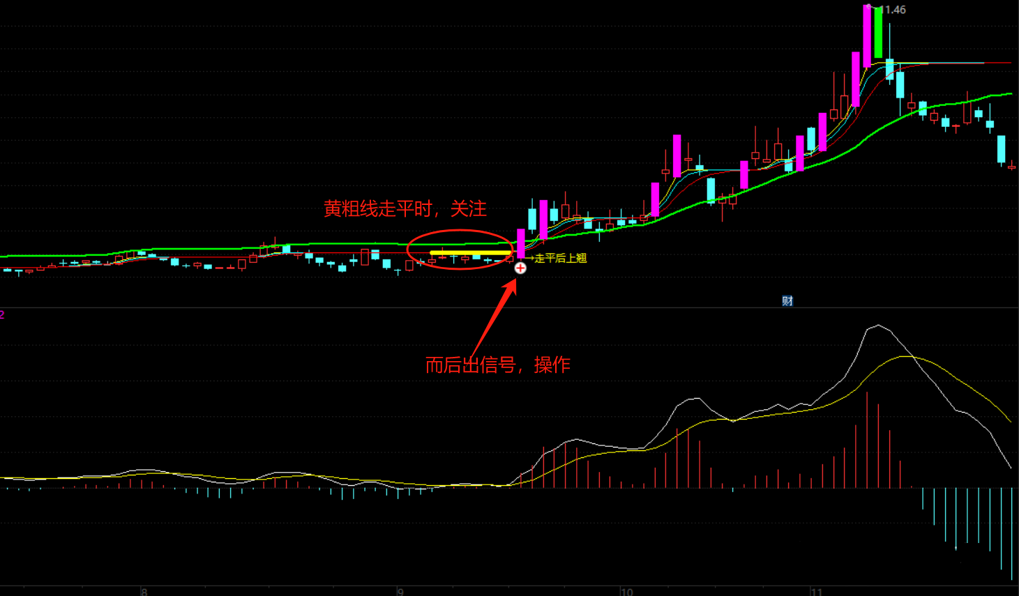 黄色粗线在阶段底部区域为结构紧凑型支撑线,当其走平时需关注,而后出现“+号、走平后上翘”的突破信号时再操作。