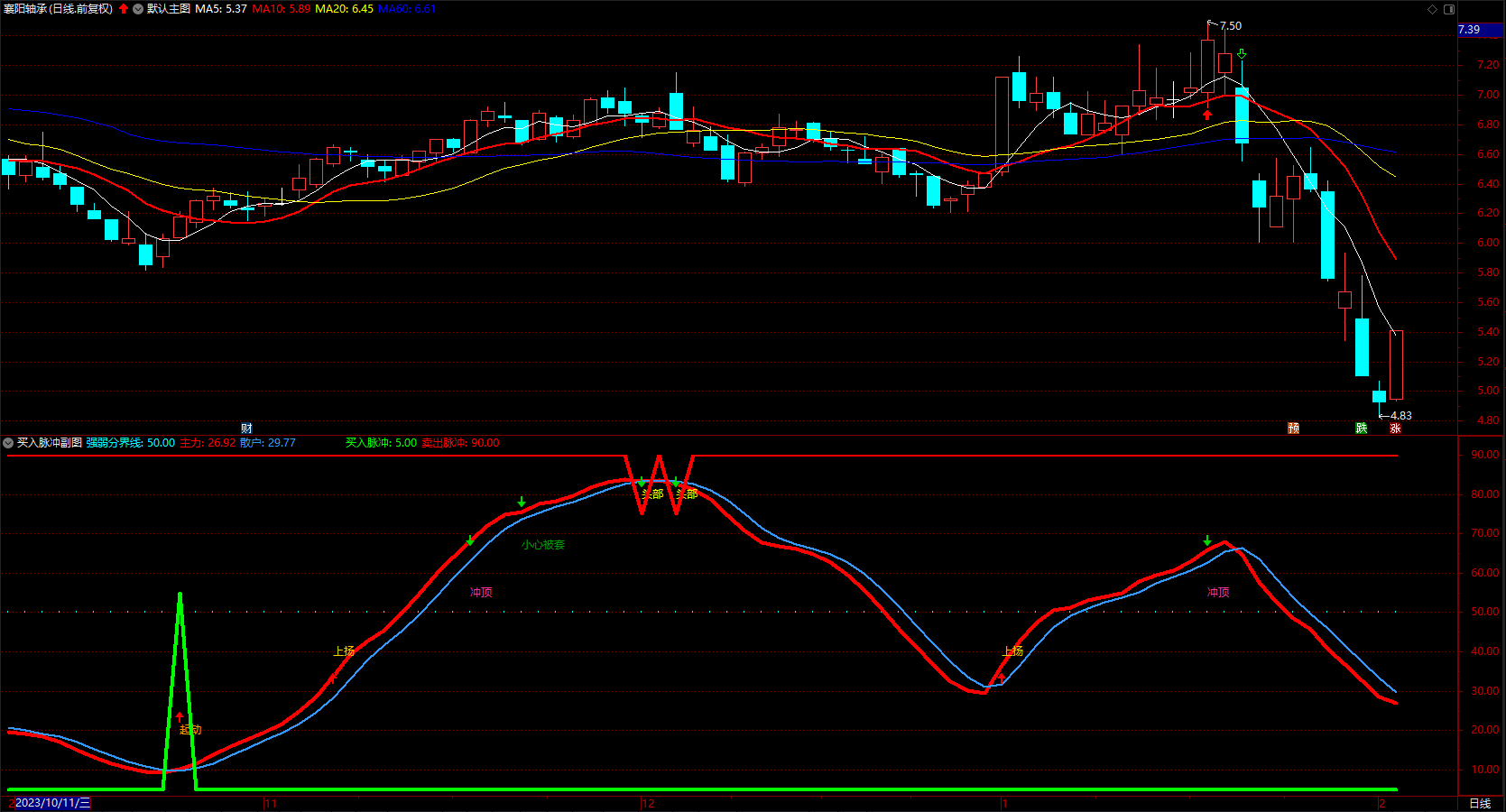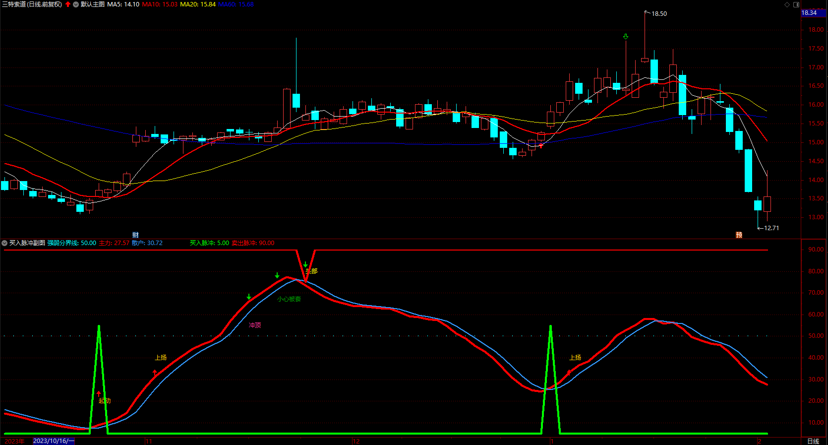 卖出脉冲:IF(CROSS(散户,主力) AND 散户>75,75,90),LINETHICK4,COLORRED;