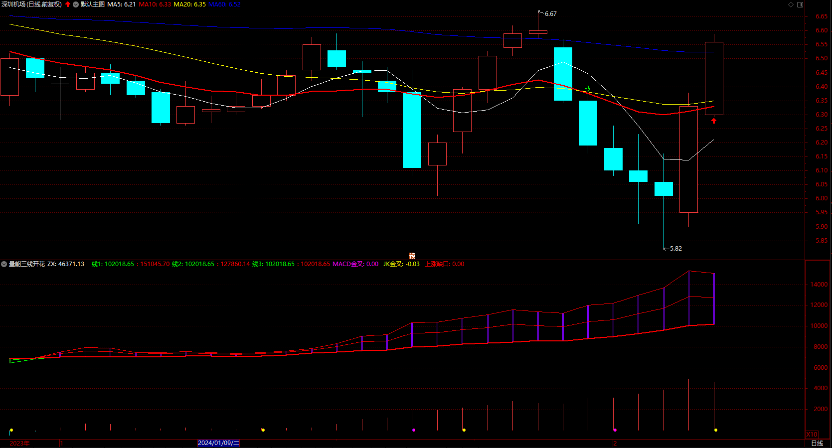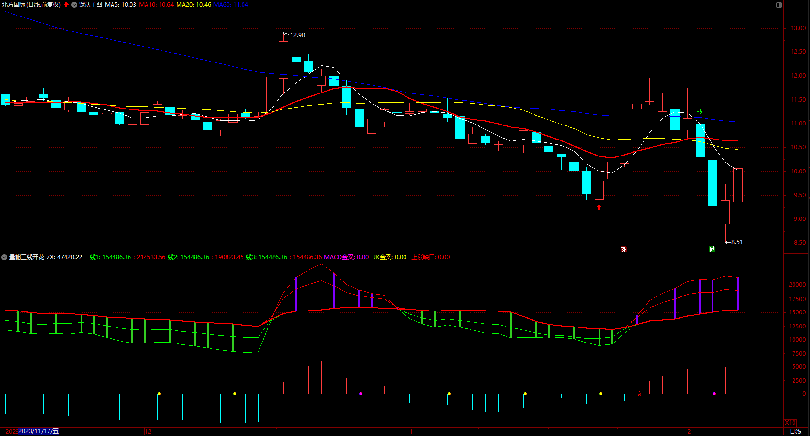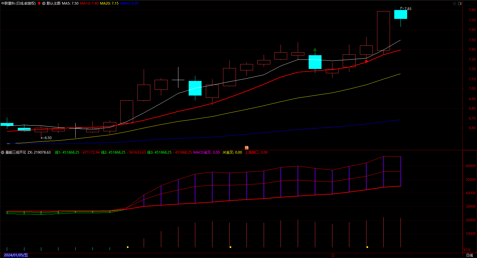 线A3:=(MA(VOL,20)+MA(VOL,60)+MA(VOL,120))/3,COLOR00FF00,LINETHICK2;ZX:2*(线A1-线A2), COLORSTICK;