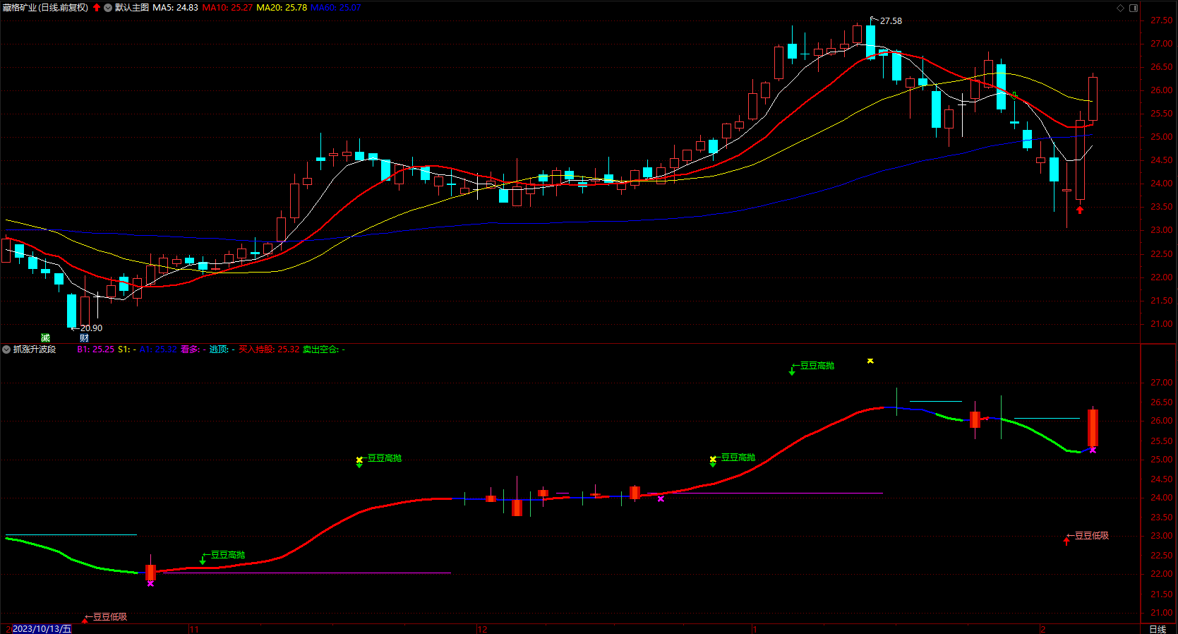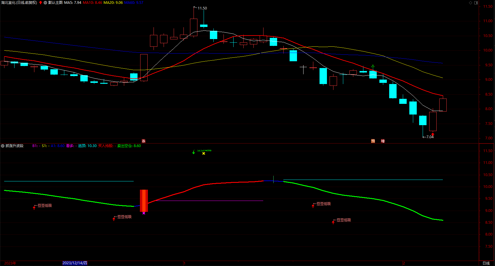 DRAWTEXT(CROSS(庄家,散户) AND 散户>70,H+0.05,'←豆豆高抛'),COLORGREEN;
