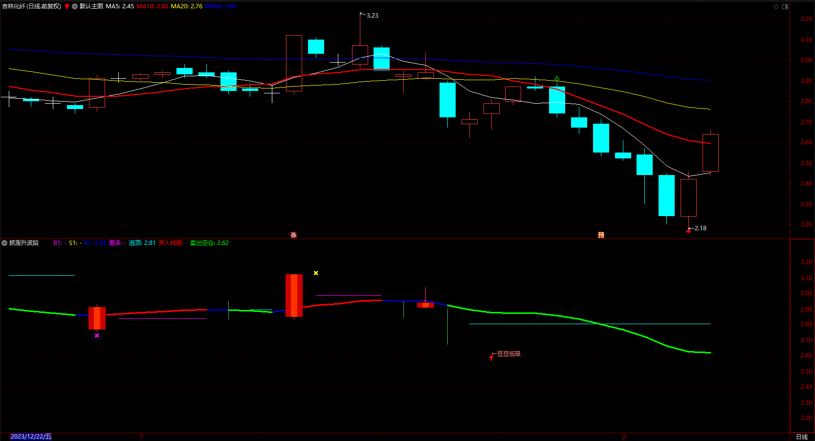 DRAWTEXT(CROSS(散户,庄家) AND 散户<30,L-0.05,'←豆豆低吸'),COLORLIRED;
