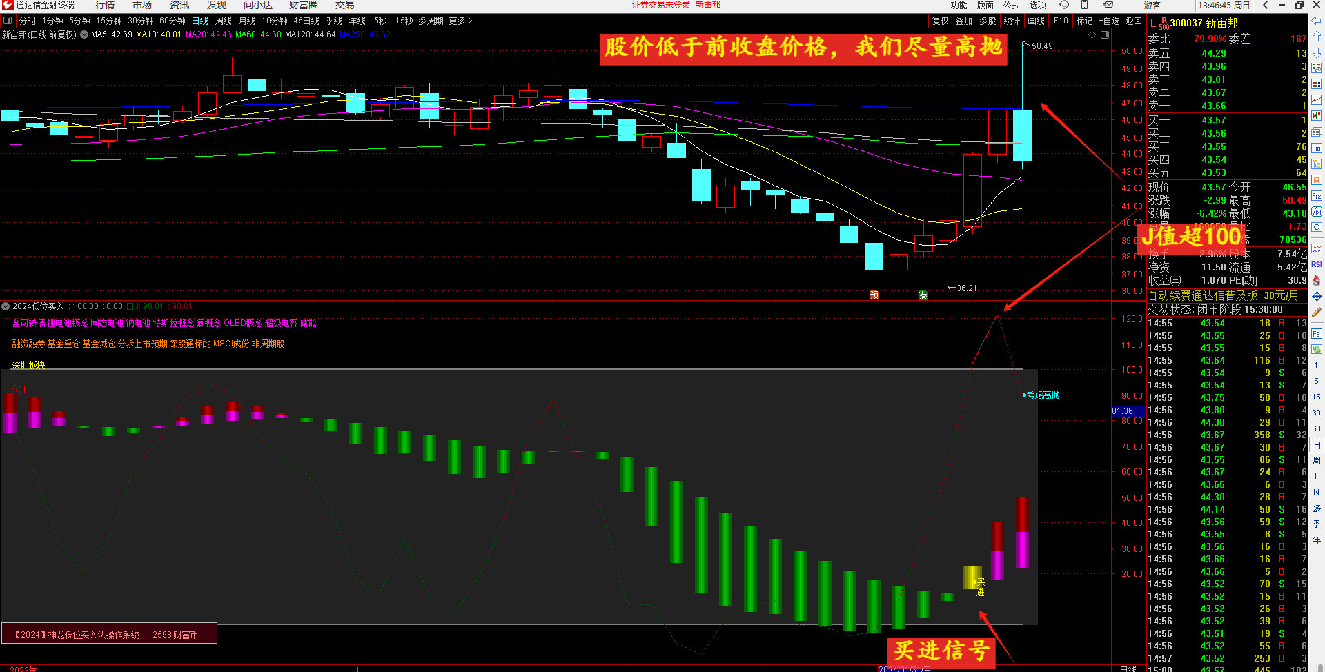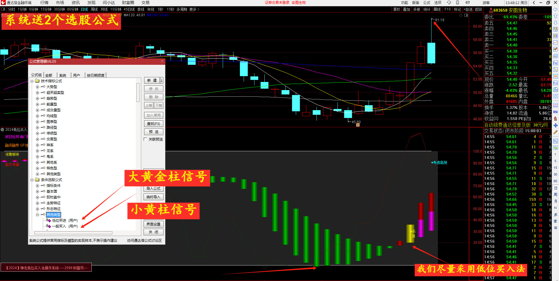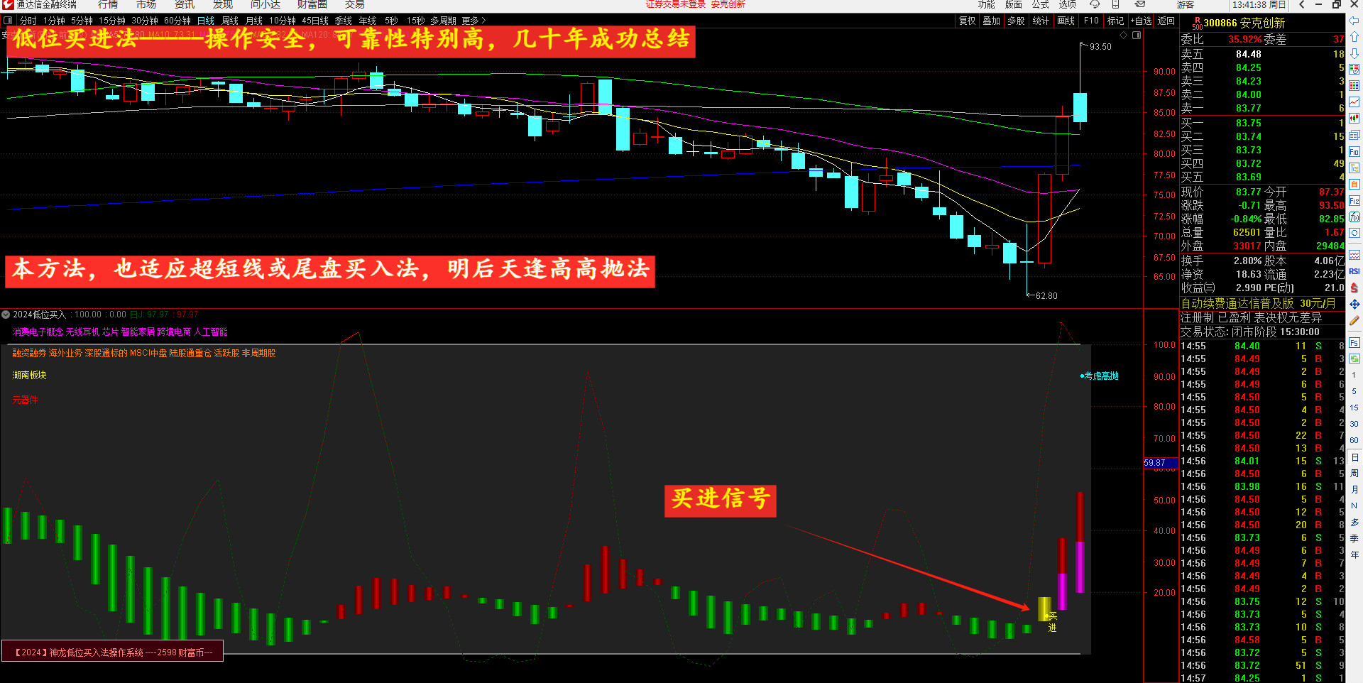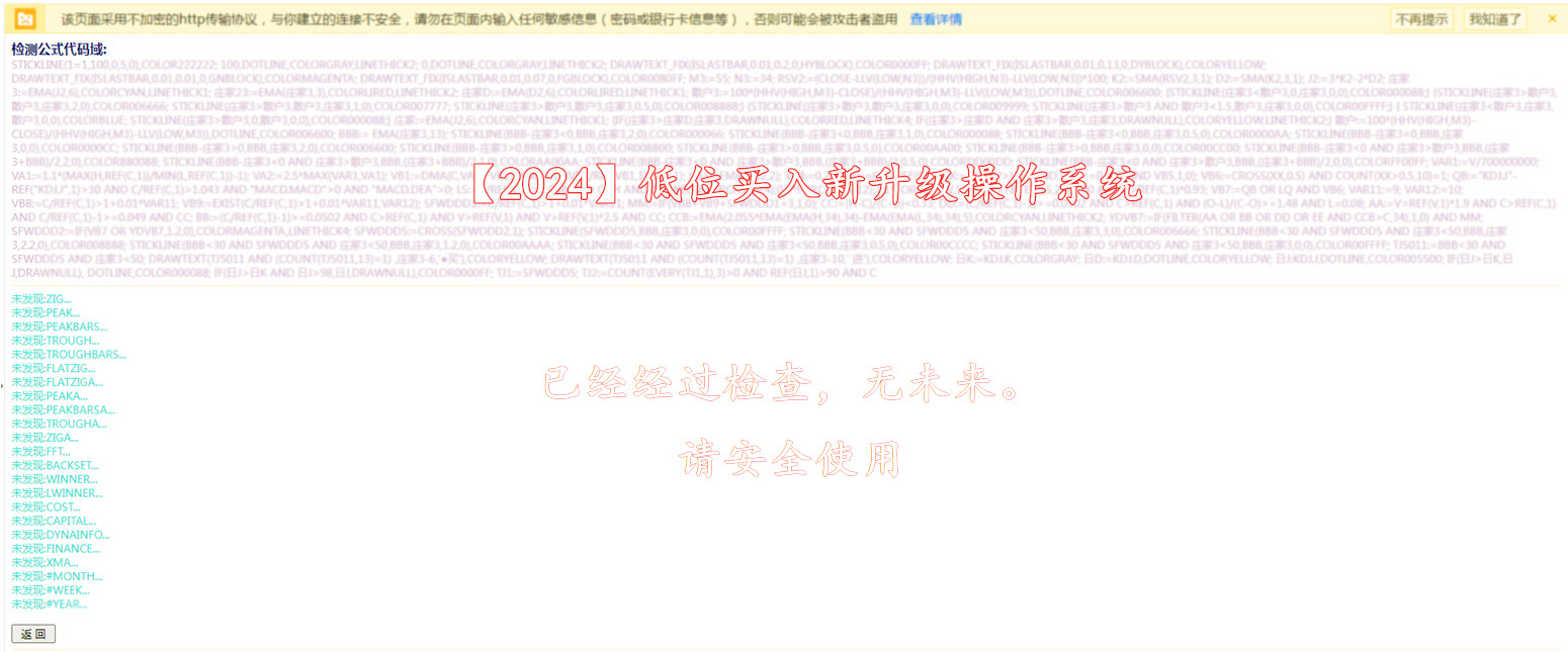 要想短线挣钱快,必须优先考虑安全性,我们经过几十年的操作总结。为让大家少化精力,省脑力。操作安全,成功高,短线快涨,逢高抛。【2024】新升级的低位买进法,一定不会让你失望,可尾盘,可盘中,自动选股,可预警。