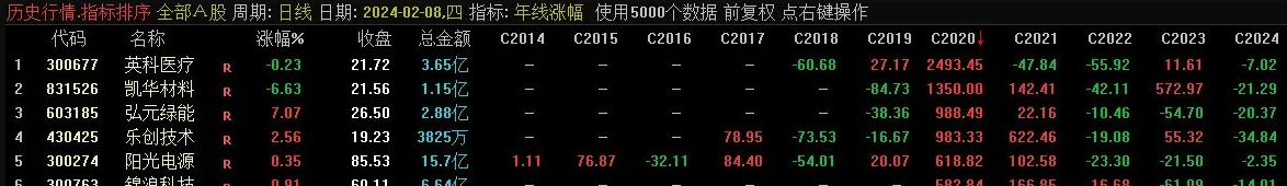 (金典通达信《年线涨幅》副图排序指标 快速了解10年内K线跨年涨幅 源码附图,推荐给大家)