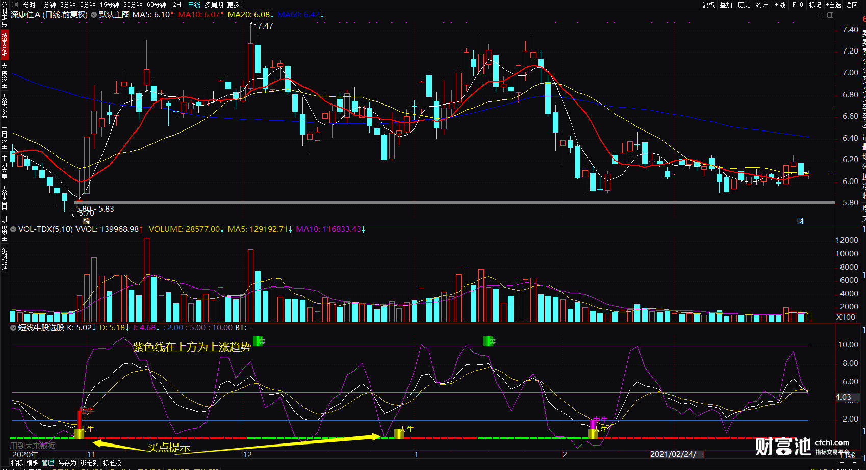 买点:价不破中线决策线一路持仓,破短线决策减半仓,出现“大牛”字样可关注,出现“短牛”可作为买点,预示着这个股票上涨的趋势,这个时候买入,可能会赚得更多!