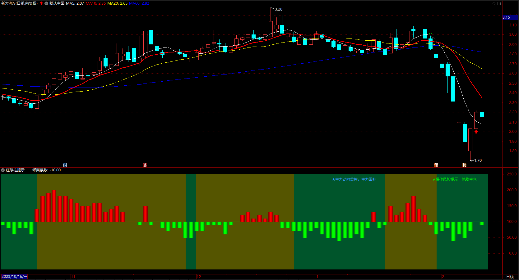 DRAWTEXT_FIX(T10,0.86,TS10,0,'★操作风险提示:盘跌减仓'),COLORWHITE;