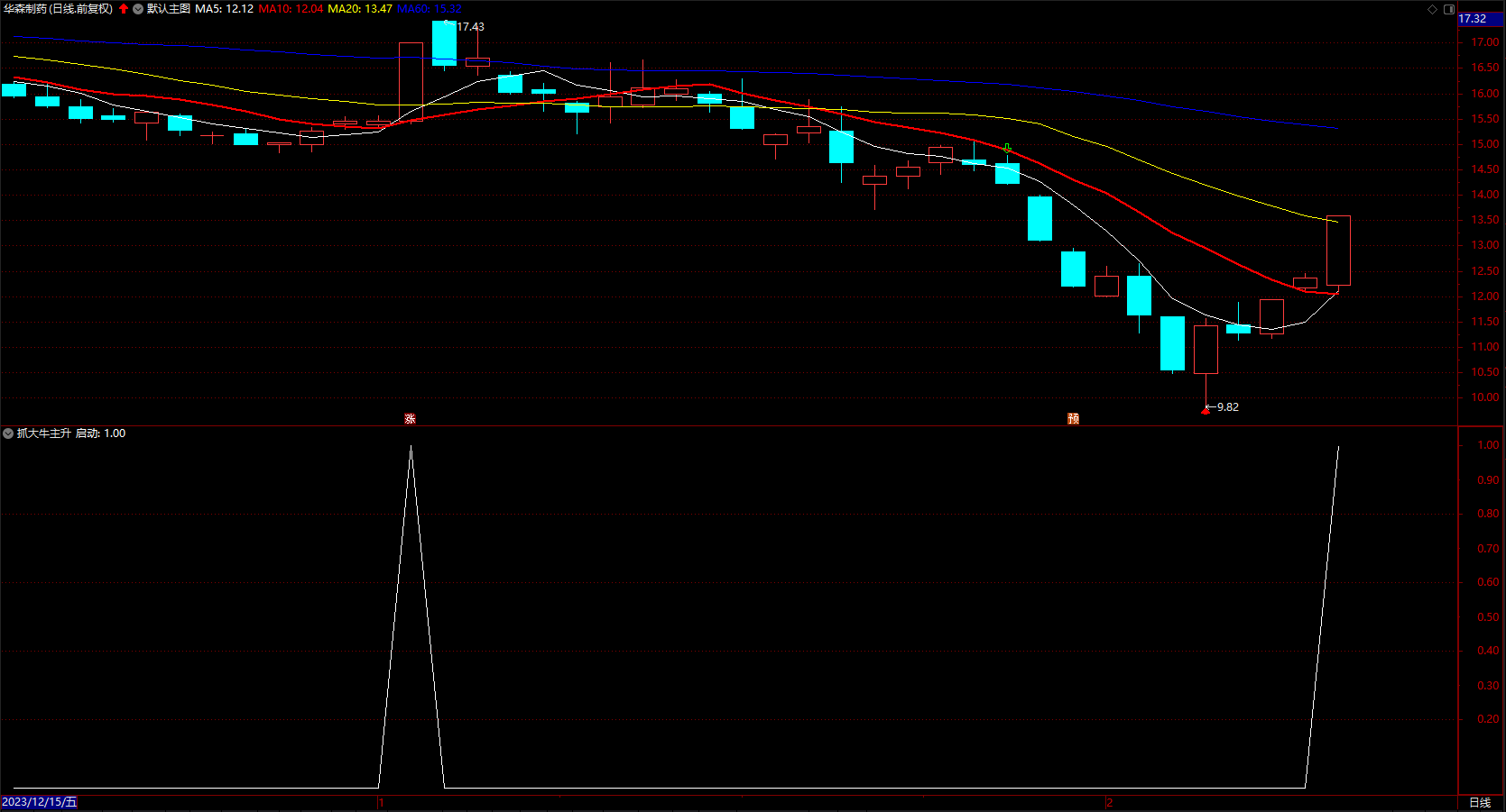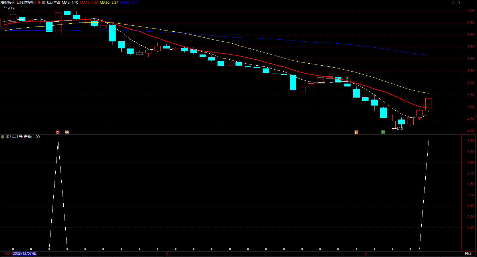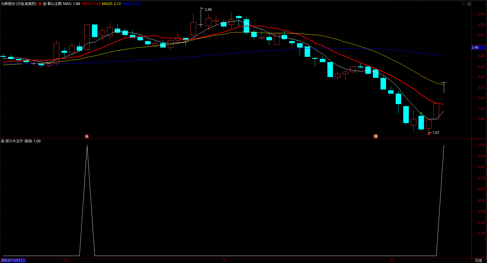 优化了一下,简单实用,一目了然。副图三角形信号提示上涨。