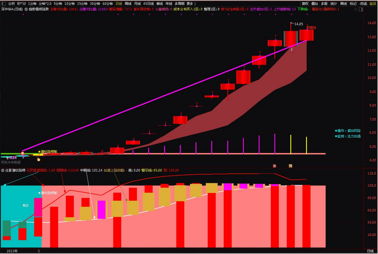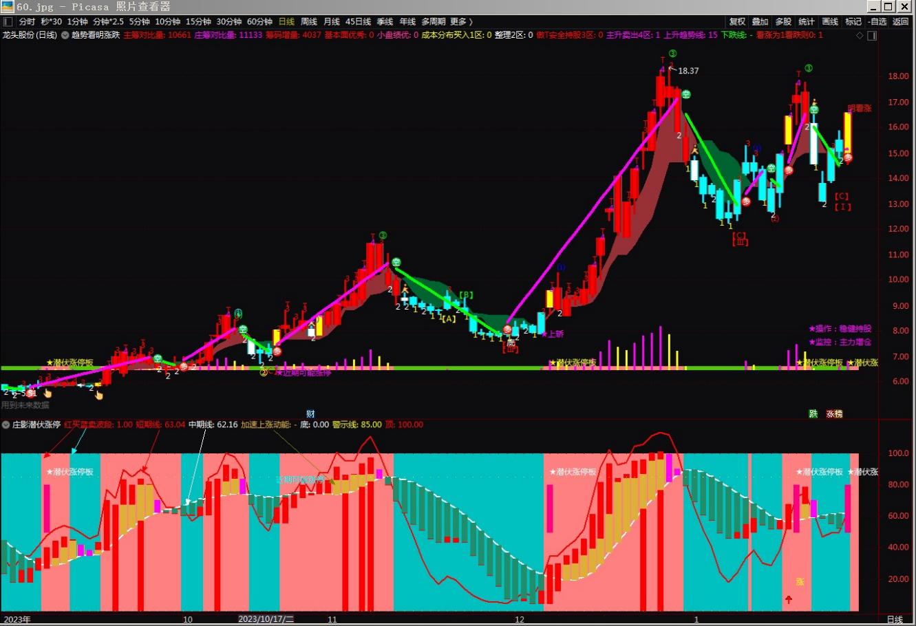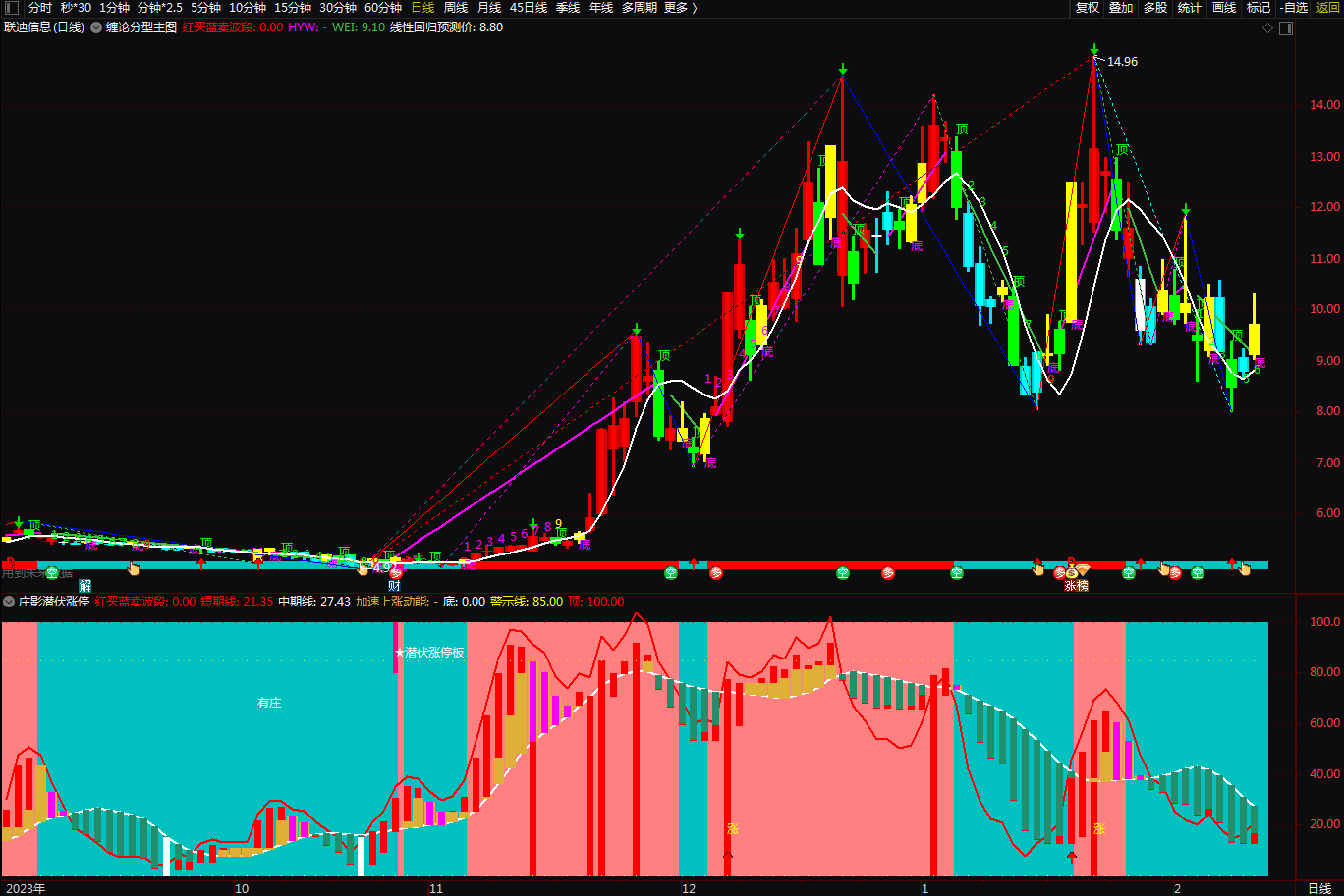 (庄影潜伏涨停副图。有波段操作,潜伏涨停板,近期可能涨停,有庄,加速上涨动能等提示。)