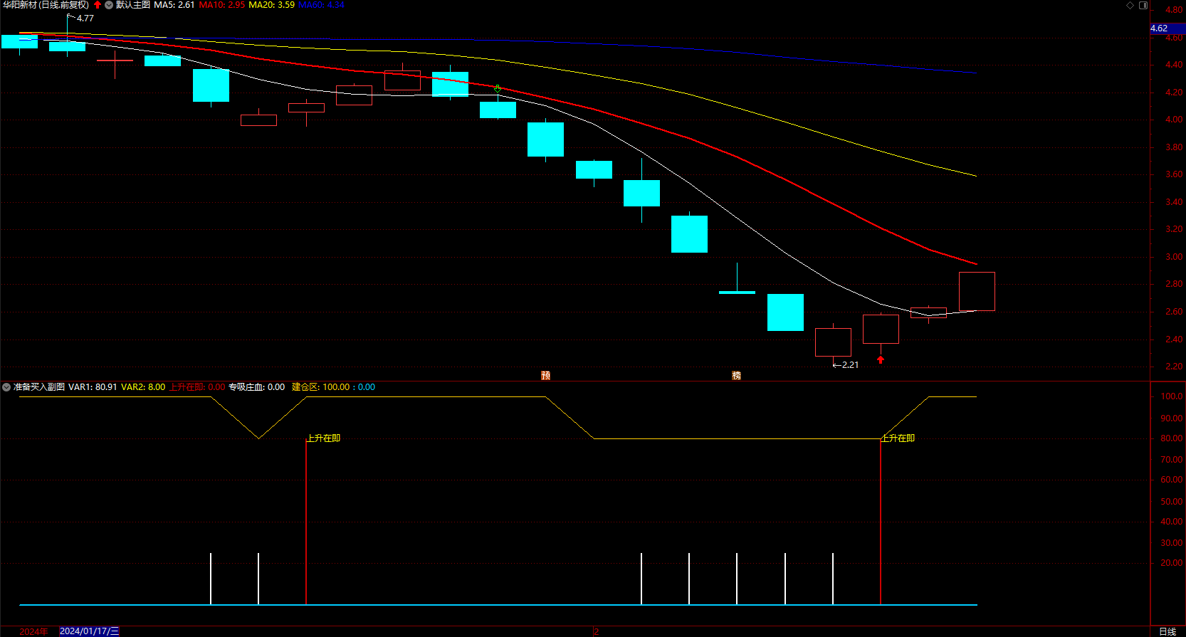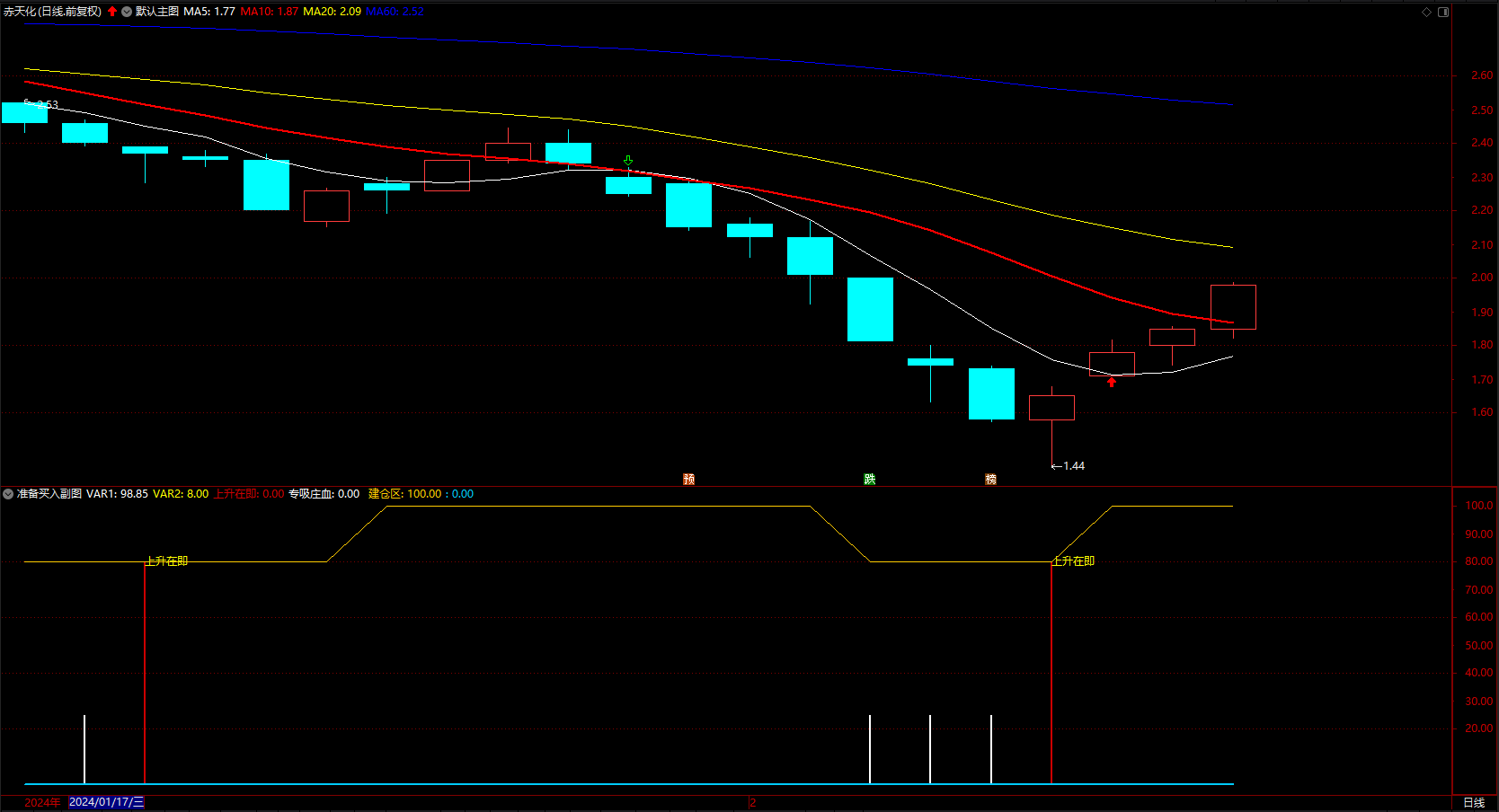 上升在即: IF(CROSS(VAR1,VAR2),80,0),STICK,COLOR0000CC,LINETHICK2;