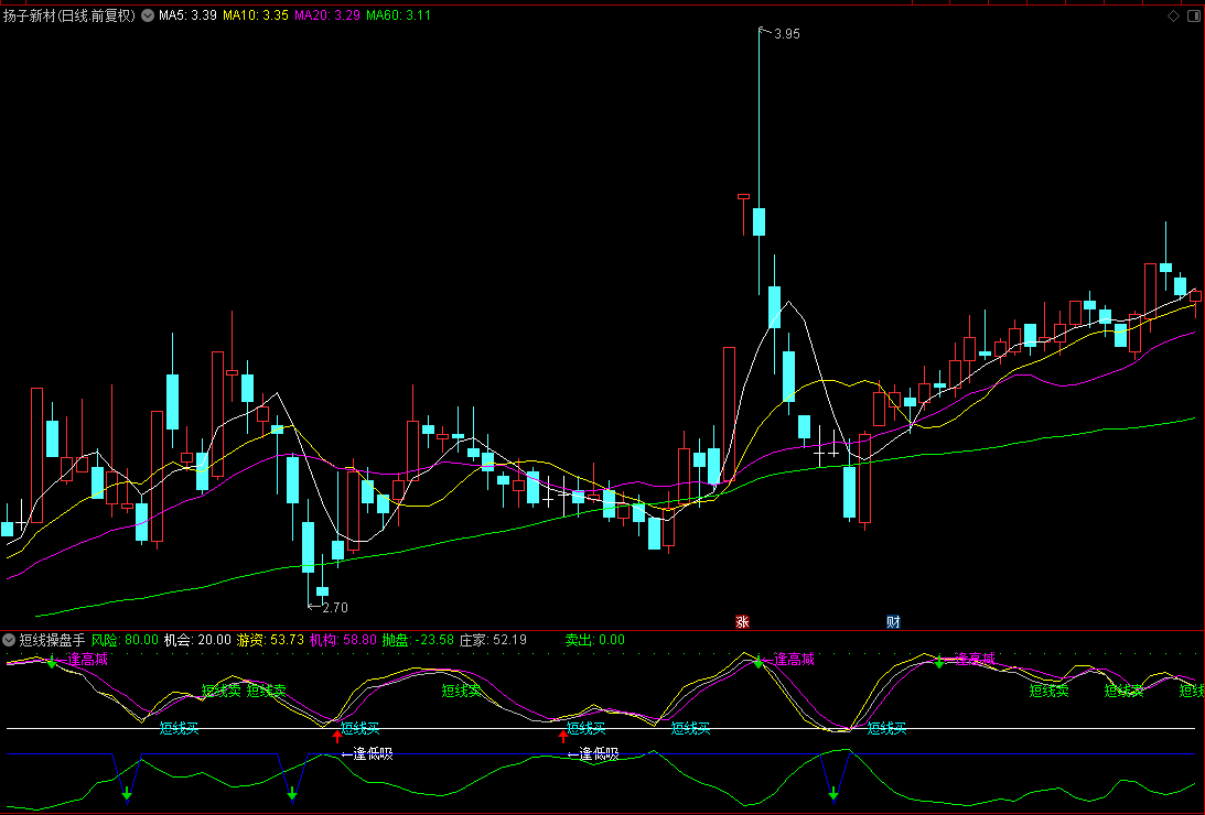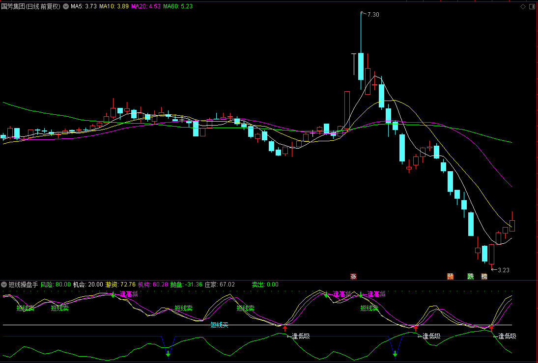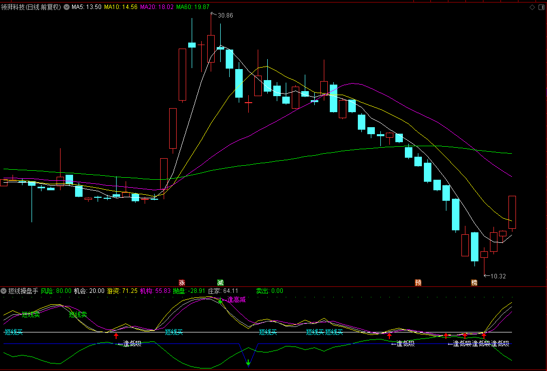 针对短线研发的好用指标,包含逢低吸买入,短线买入,逢高减仓卖出,短线卖出,反弹卖等多个信号,多重全方位提示买卖预警。