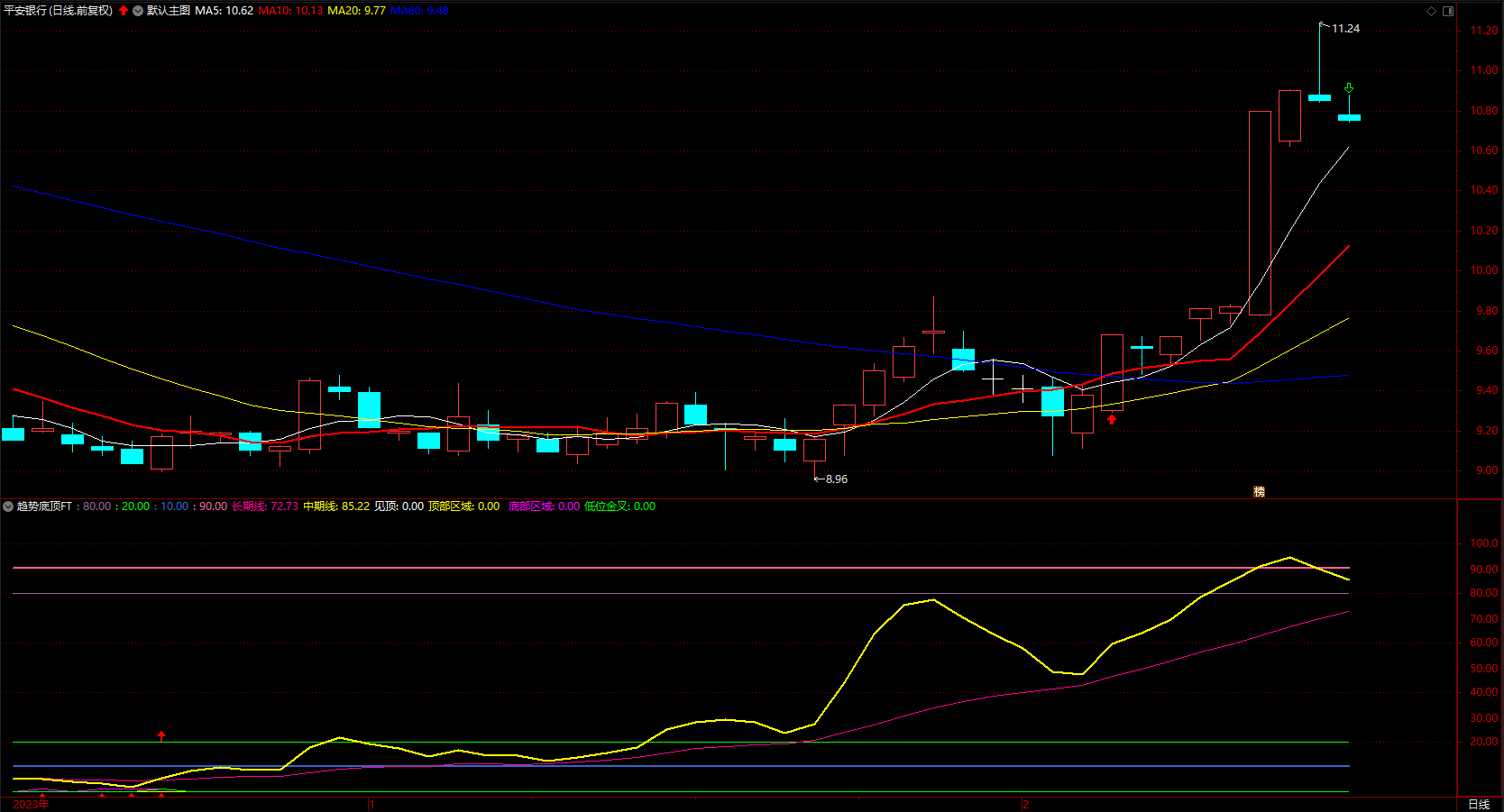 顶部区域:(中期线<REF(中期线,1) AND REF(中期线,1)>80) AND (REF(短期线,1)>95 OR REF(短期线,2)>95 ) AND 长期线>60 AND 短期线<83.5