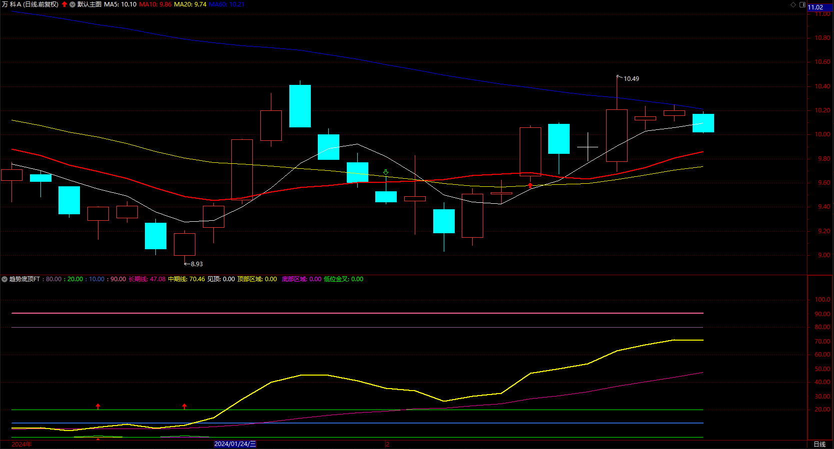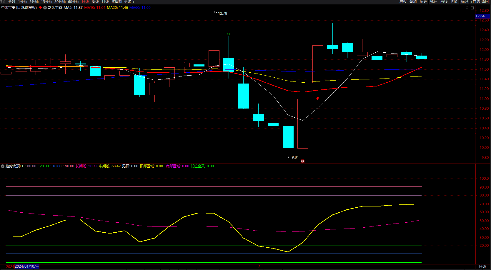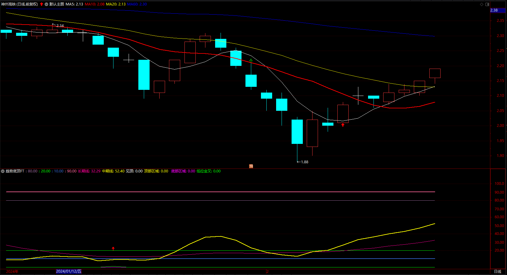 底部区域:中期线<2 OR (长期线<12 AND 中期线<8 AND (短期线<7.2 OR REF(短期线,1)<5) AND (中期线>REF(中期线,1) OR 短期线>REF(短期线,1)))