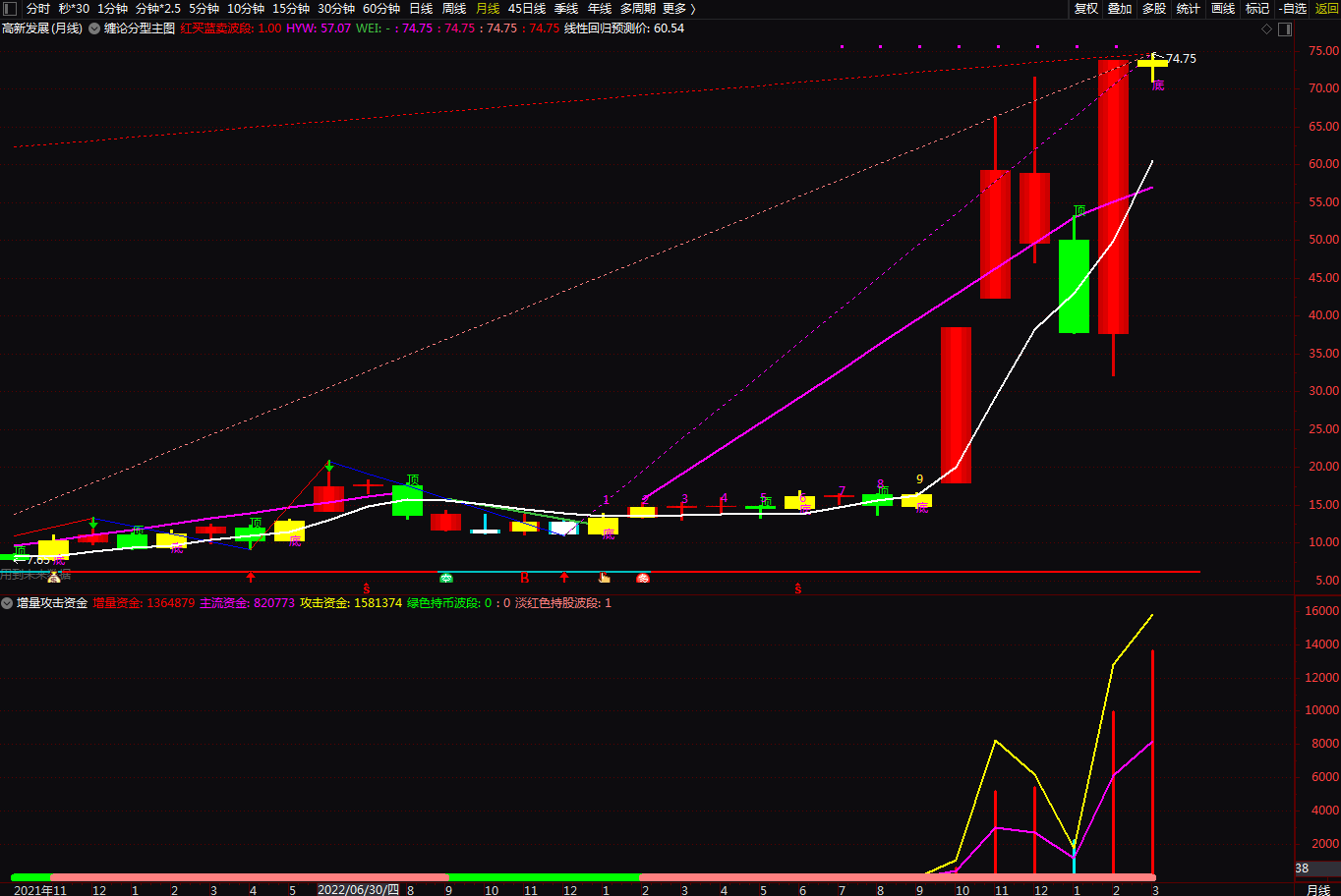 1.主流资金(洋红线)和攻击资金(黄线)2条线同步上升,上升力度越强越好,增量资金红柱越高越好,同时伴随放量,有希望大涨一波!