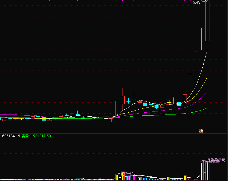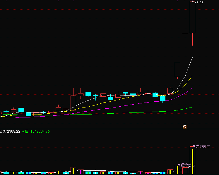 条件: 当满足又一系列条件时(具体条件见定义),在成交量位置书写“强势参与”文字,颜色为COLORCC99CC。