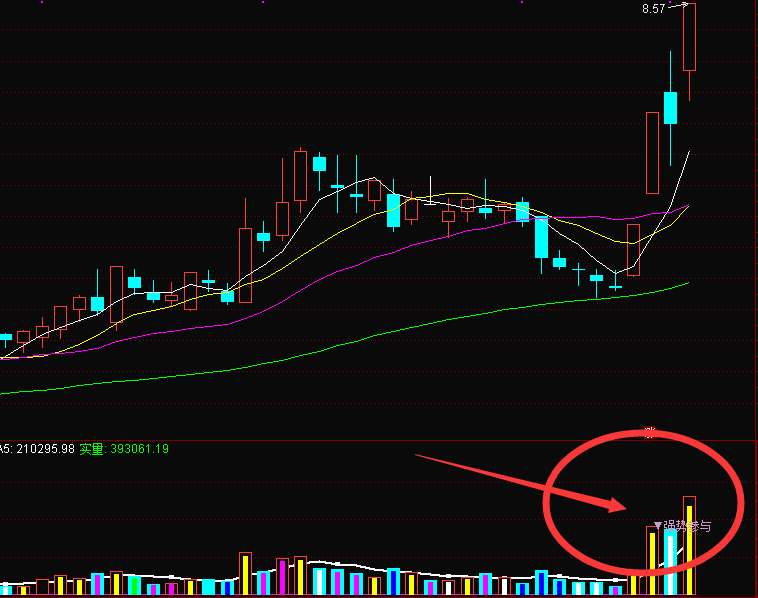 条件: 当满足另一系列条件时(具体条件见定义),在成交量位置书写“逢低跟进”文字,颜色为COLORFF00FF。