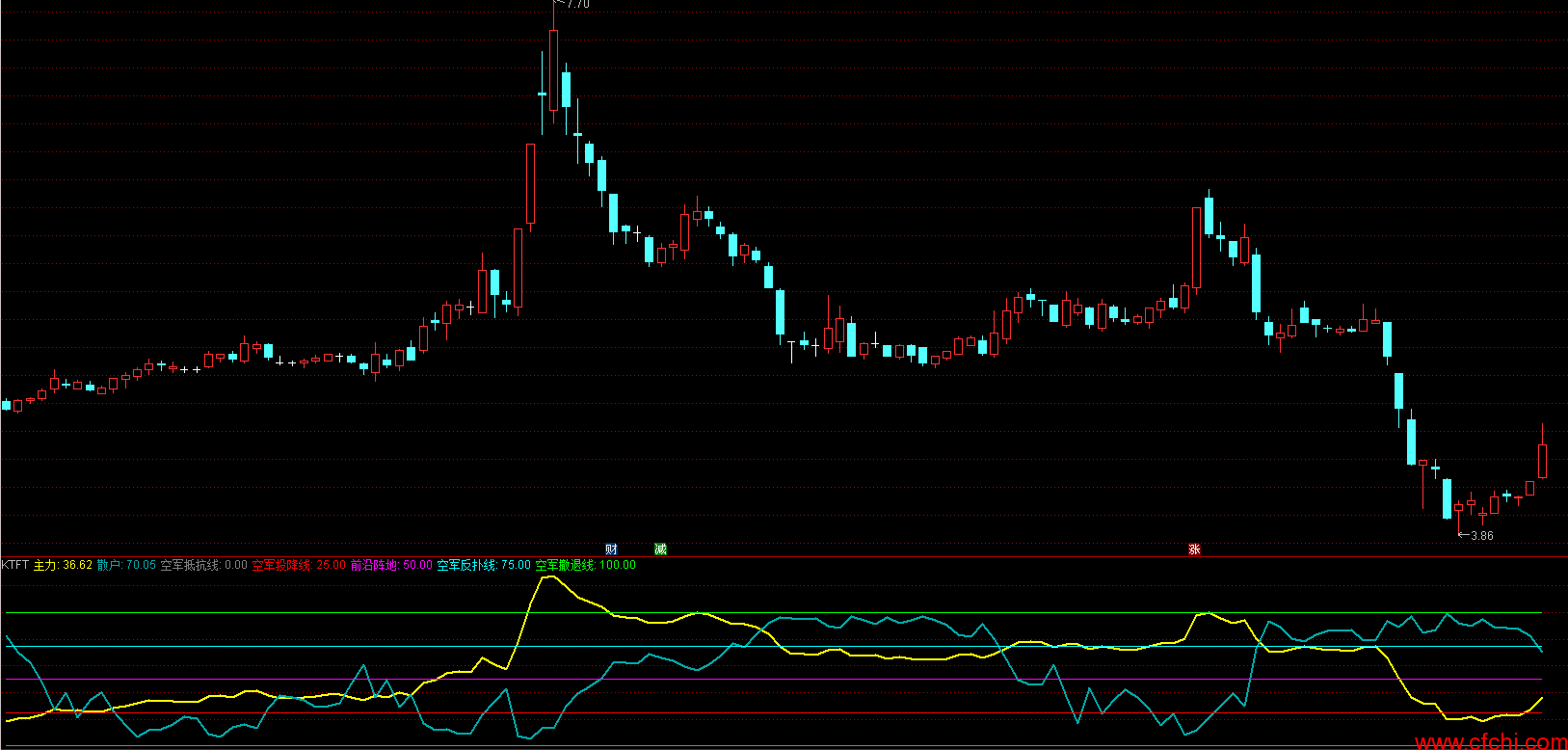 筹码穿越顶底,本人原创,在某指标网被评为精华指标,可以用于任何周期,做分时指标也极其有用,本人自用的之一