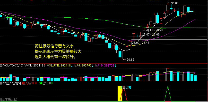 【探庄入场】副图指标,包含主力资金吸筹信号,买入信号,建仓信号,黄柱吸筹信号若有文字提示则表示主力吸筹量较大近期大概会有一波拉升,毕竟大资金入场是要获利出的最次的结果也得是平出或微亏,买入信号与建仓信号含有一个BACKSET函数,可能会引起信号的移动,使用时要稍加注意。