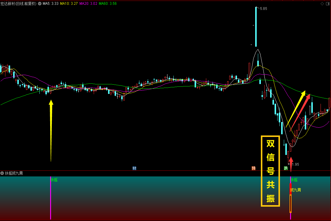 扶摇揽九霄双信号共振为主要买点,指标为企稳突破型的指标,持股时长5个交易日左右,涨幅较大可适当落袋后剩余部分仓位继续博,也可结合有卖出的指标进行卖出参考!