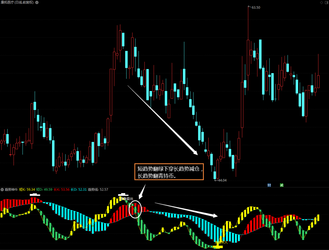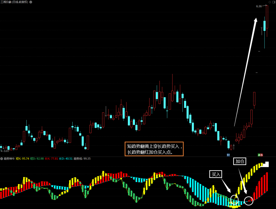 第一点,当短趋势翻黄并上穿长趋势时,这是一个买入信号。我们可以根据这个信号来判断买入时机。