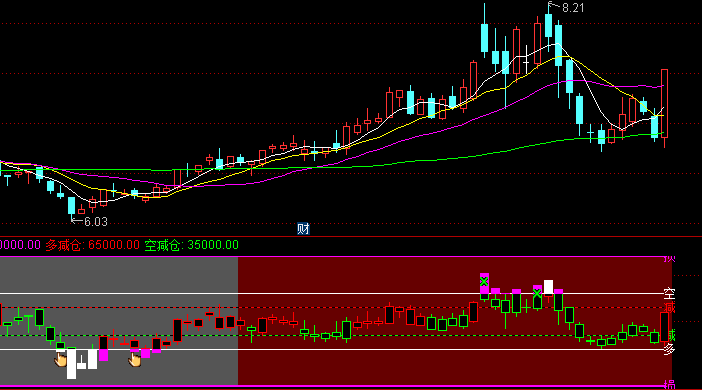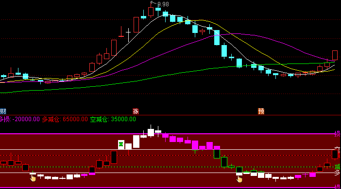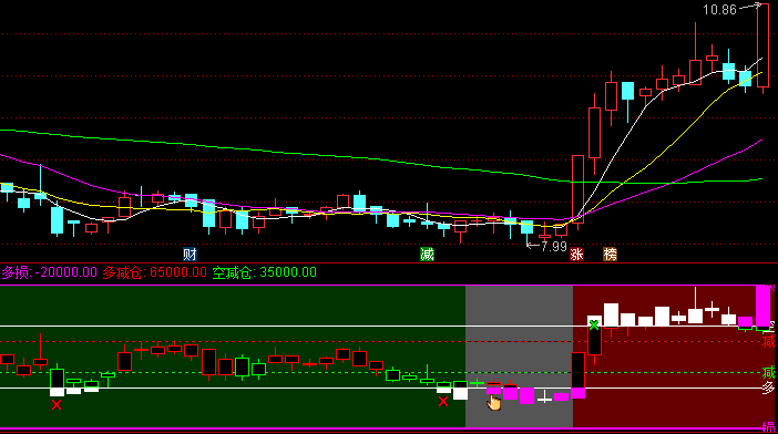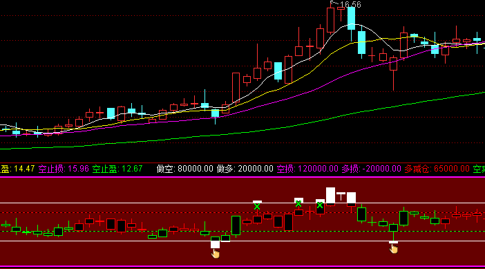 多止盈赋值:(最高价的25日偏移移动平均的25日偏移移动平均-最低价的25日偏移移动平均的25日偏移移动平均)*1+最高价的25日偏移移动平均的25日偏移移动平均,线宽为0,画白色