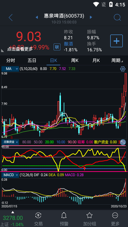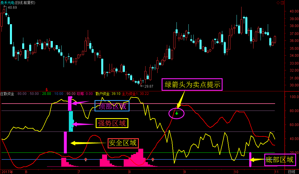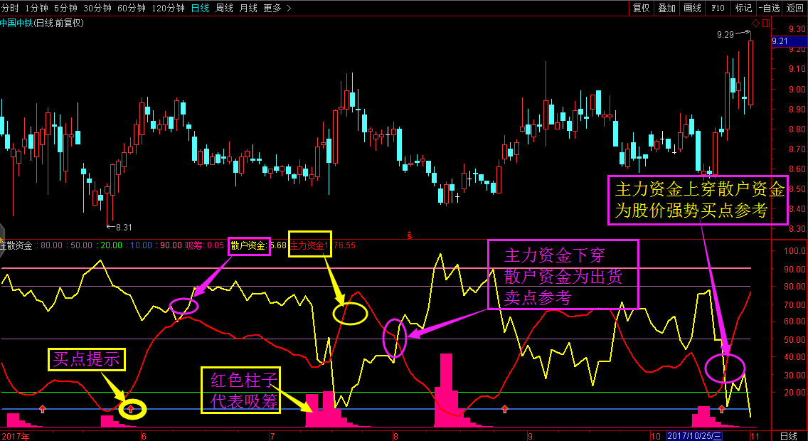 2,红色线为主力资金线,代表庄家持仓情况;向上则说明庄家增仓已经拿到了廉价的筹码,股价也会随着向上拉升,向下说明庄家减仓出跳!股价也会有相应的调整