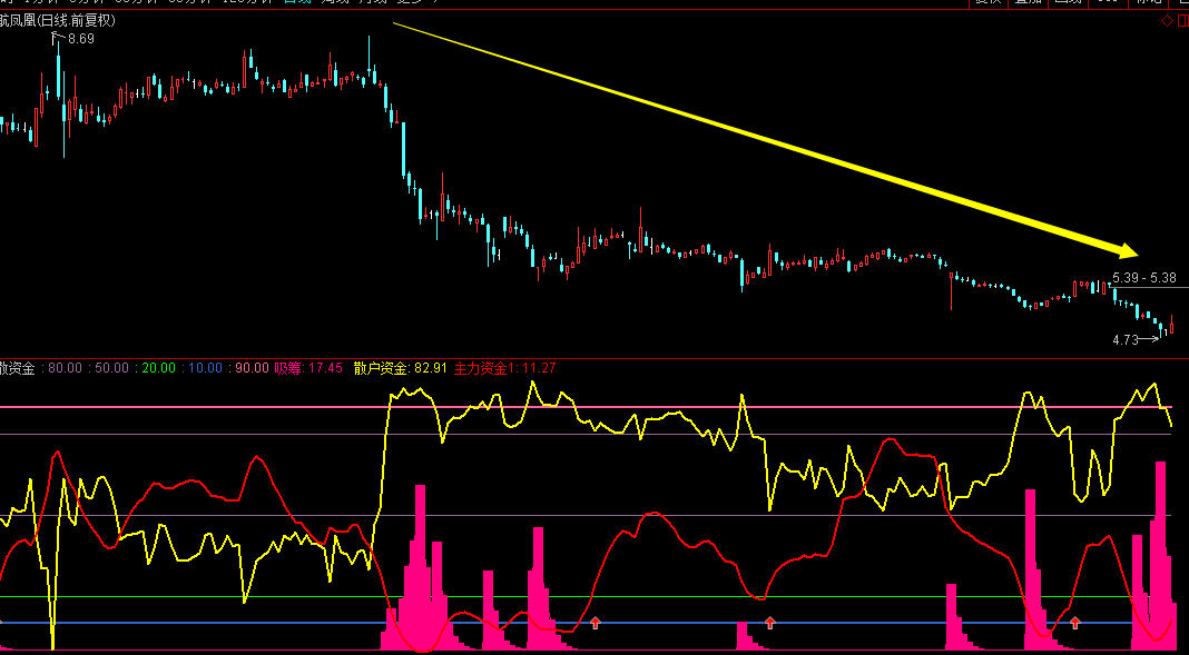 3,黄色线为散户资金线代表散户持仓情况。散户资金线向上说明散户在跟风,股价也会伴随着下跌,散户资金线下跌时说明散户在割肉砍仓,散户把筹码交出去后股价也开始了拉升,