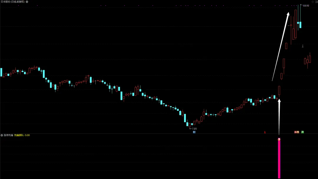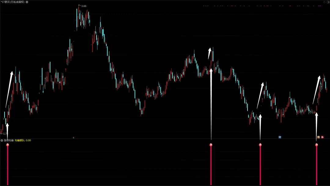- 根据上述条件生成的信号,如果先锋部队大于0,则在图表上绘制不同宽度和颜色的柱状线,并在特定位置绘制图标。