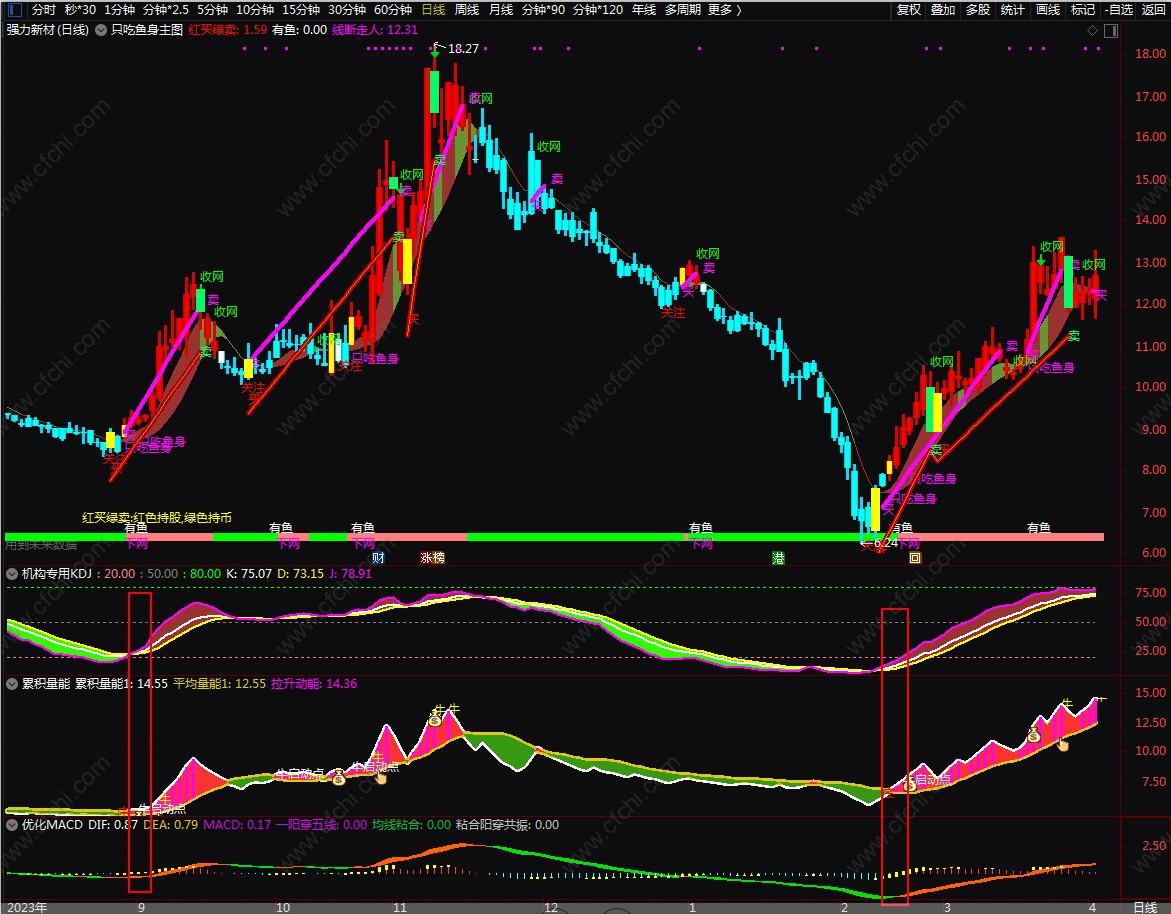 机构专用KDJ与累积量能、优化MACD结合使用,三者共振则买入。以增强分析的效果和准确性。(如上图红色框处)