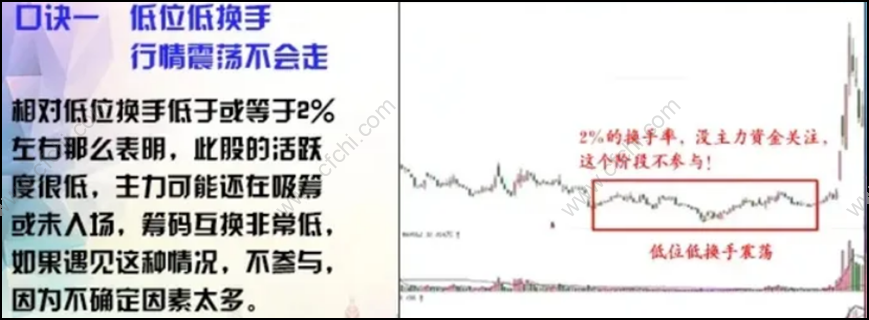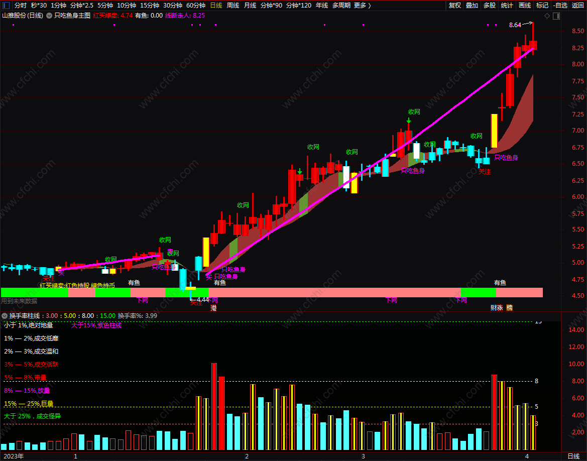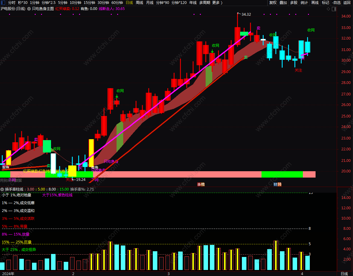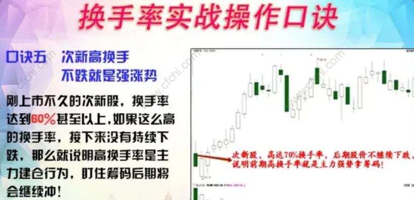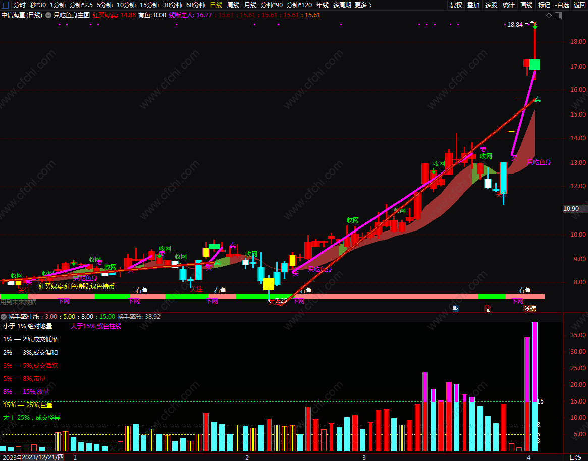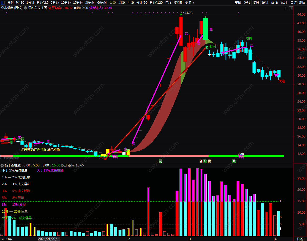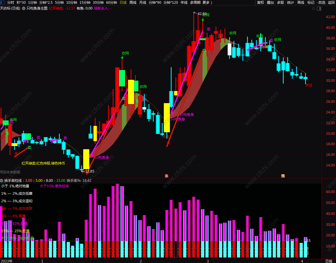 (换手率柱线副图,依据柱线的走势变化发现成交量的变化形式有绝对地量、成交低迷、温和放大、温和缩小等。)