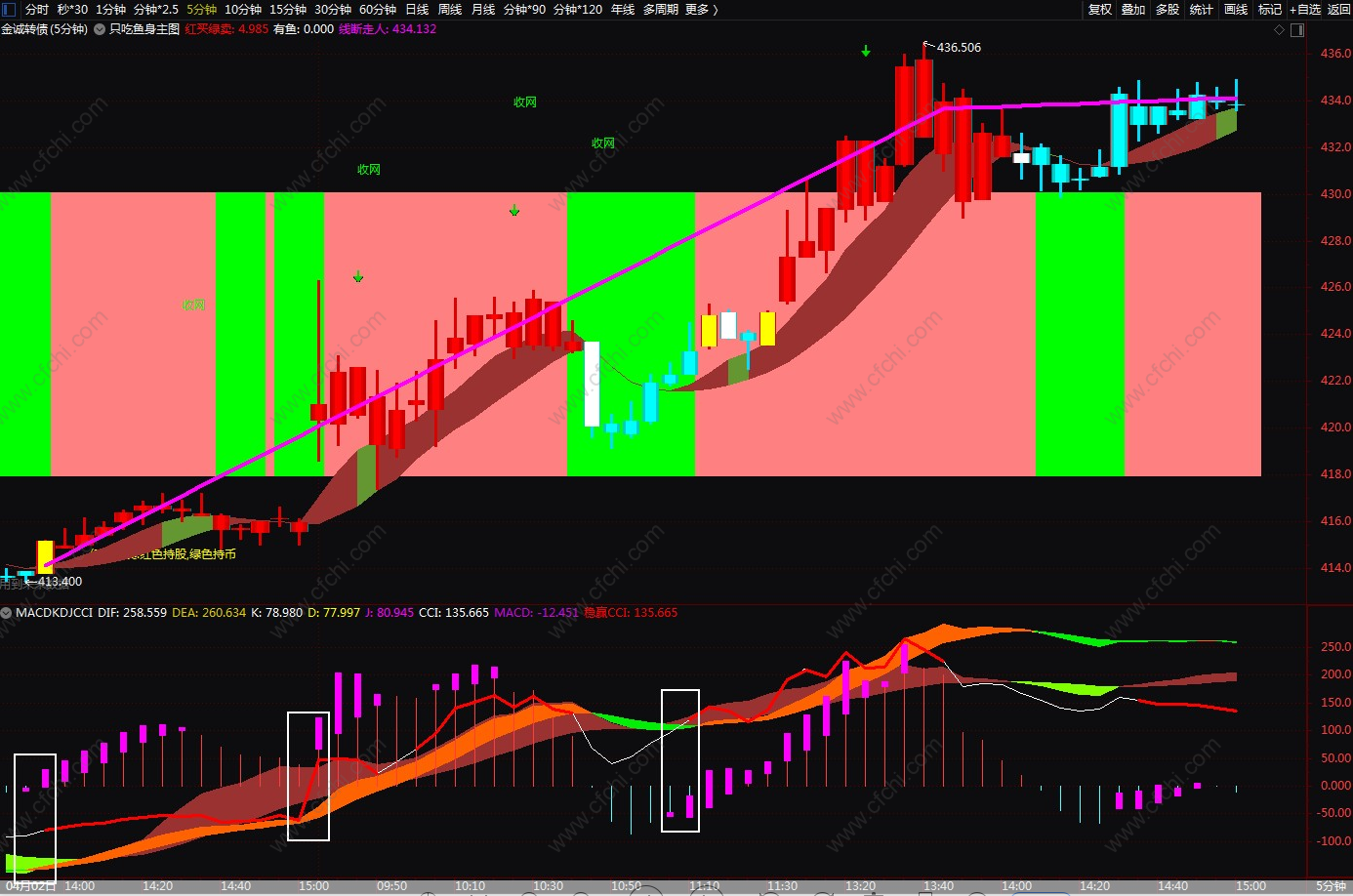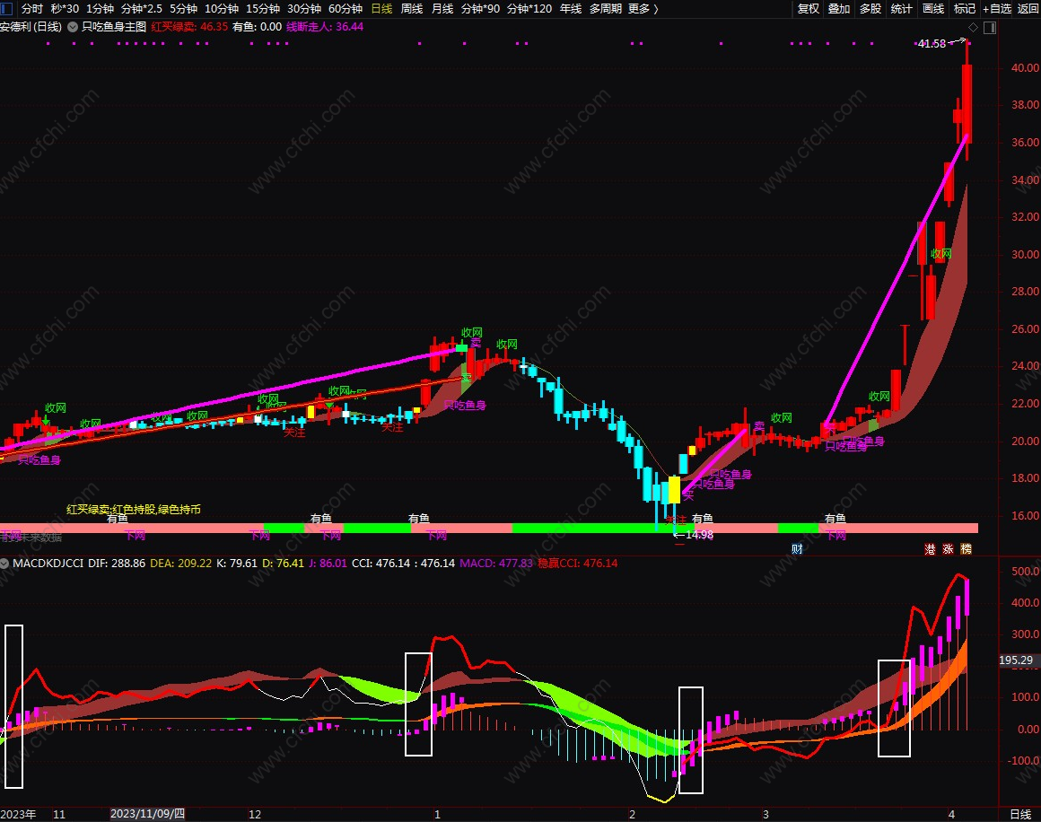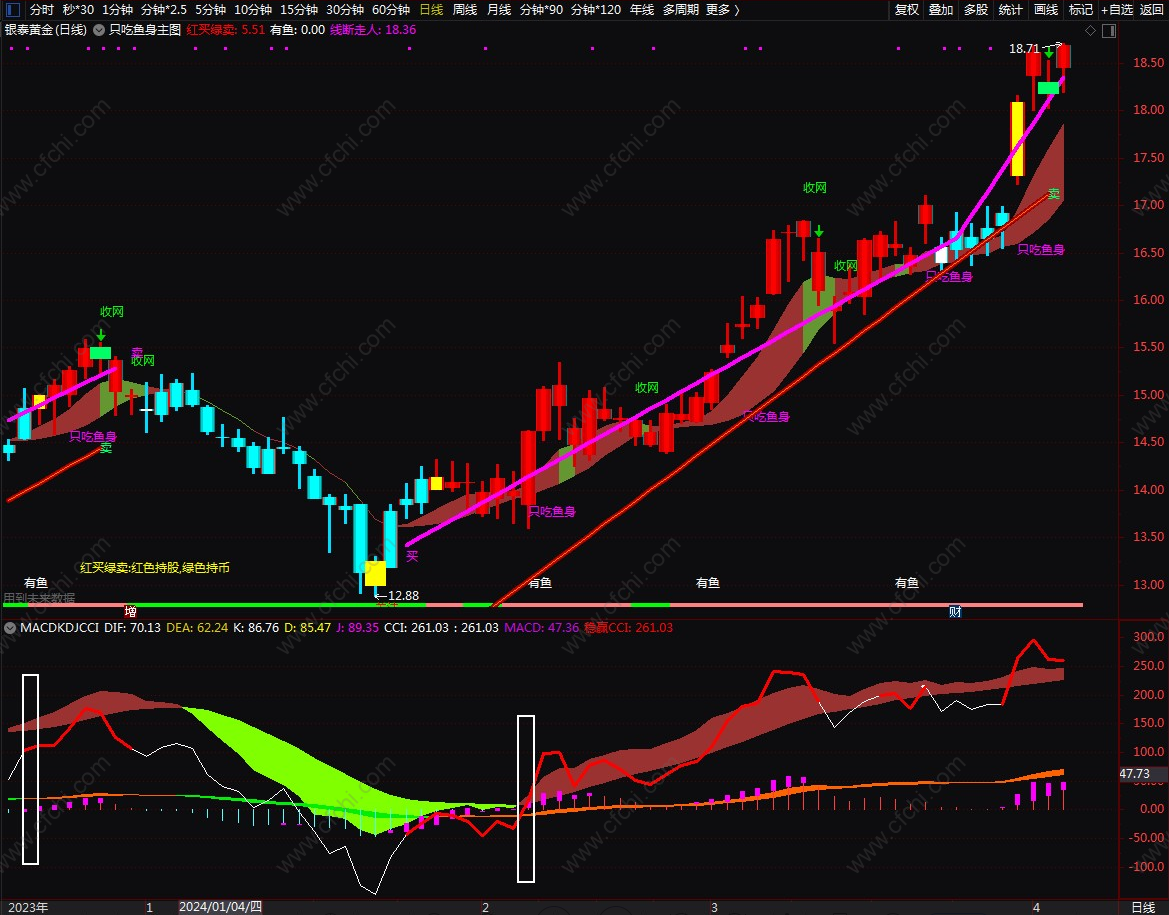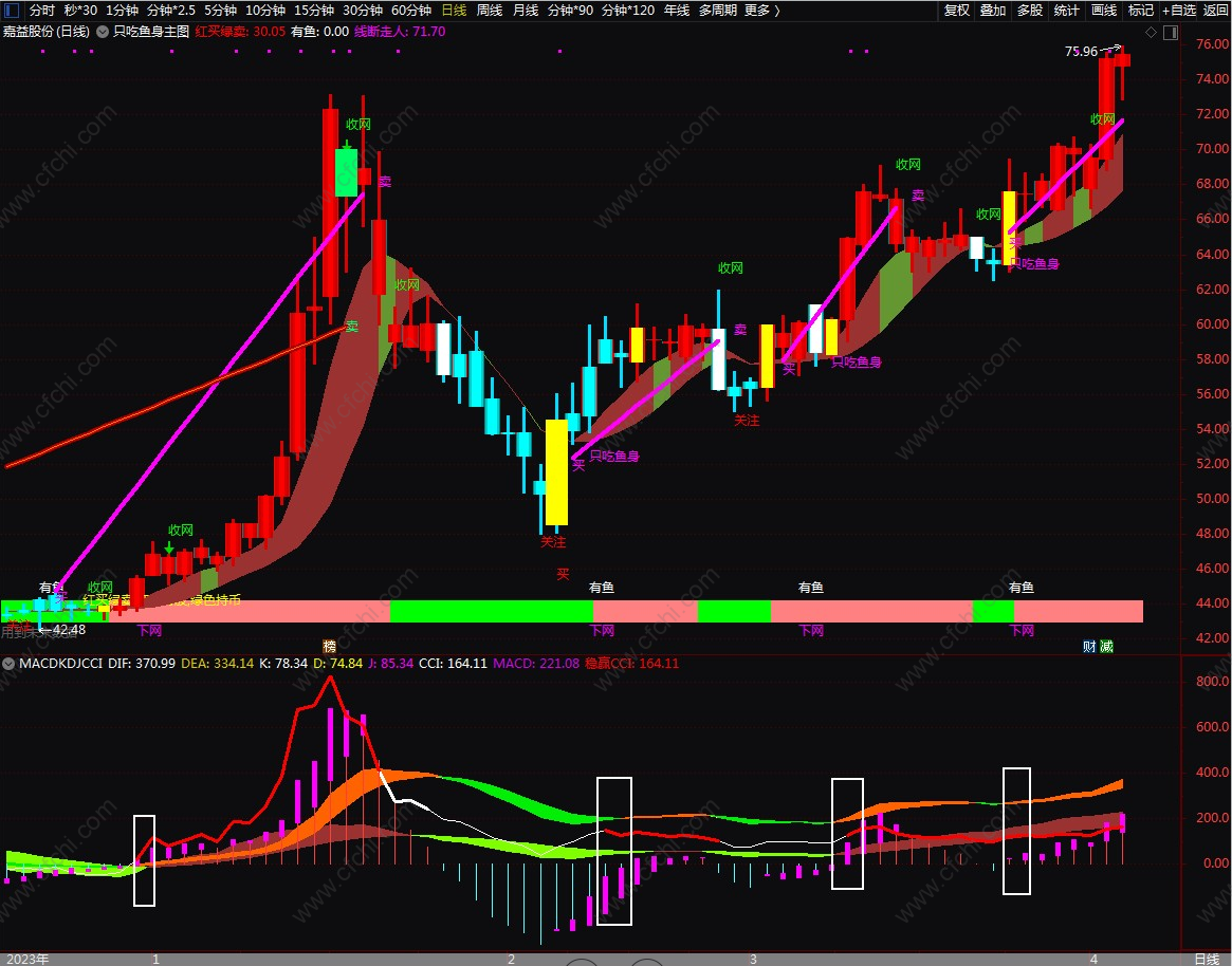 (MACD,KDJ,CCI三指标优化参数合一副图.过滤虚假的买入信号,找到共振高质量的成功买入信号。)