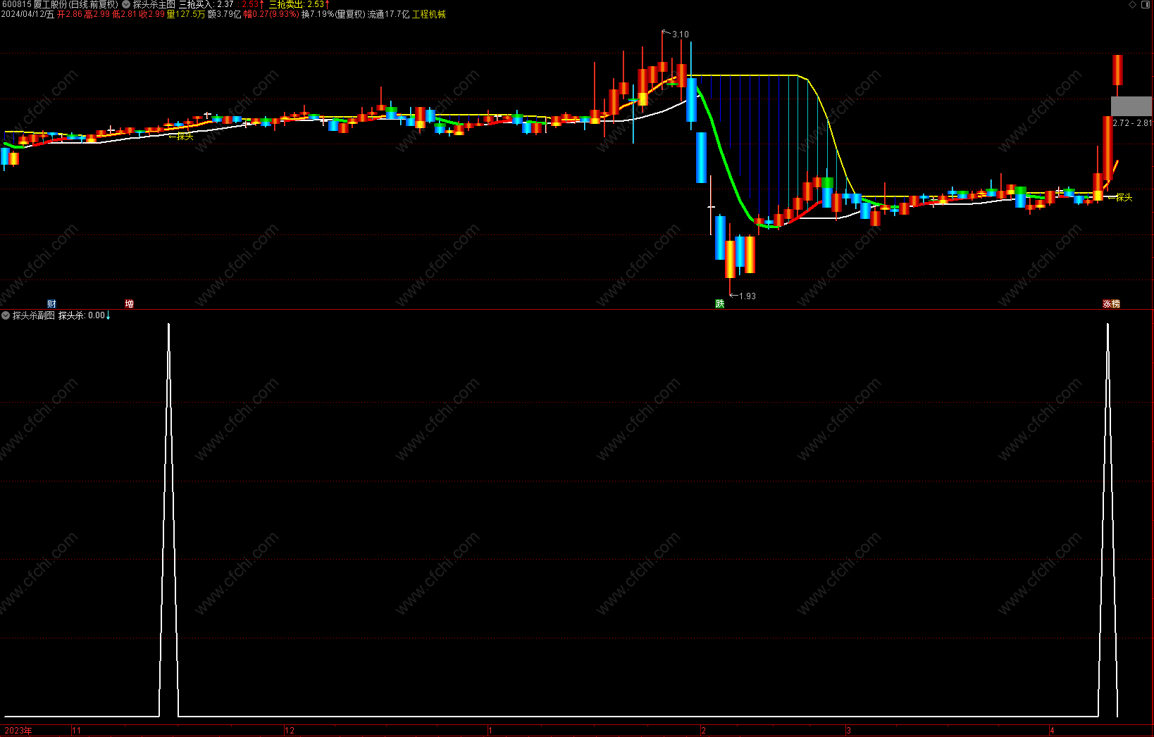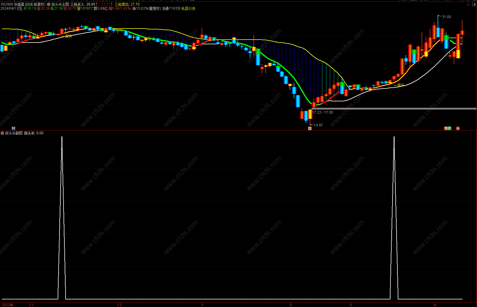2、白色线买入,黄线卖出。通过该指标能够很好的找出一只个股的支撑和压力位。也就是咱们说的买入和卖出价位。白色的那条线称之为买入线。当个股成功的突破压力后,而该股下方出现白色线的时候,就是介入时机。在白色线之上的K线,都可以进入。
