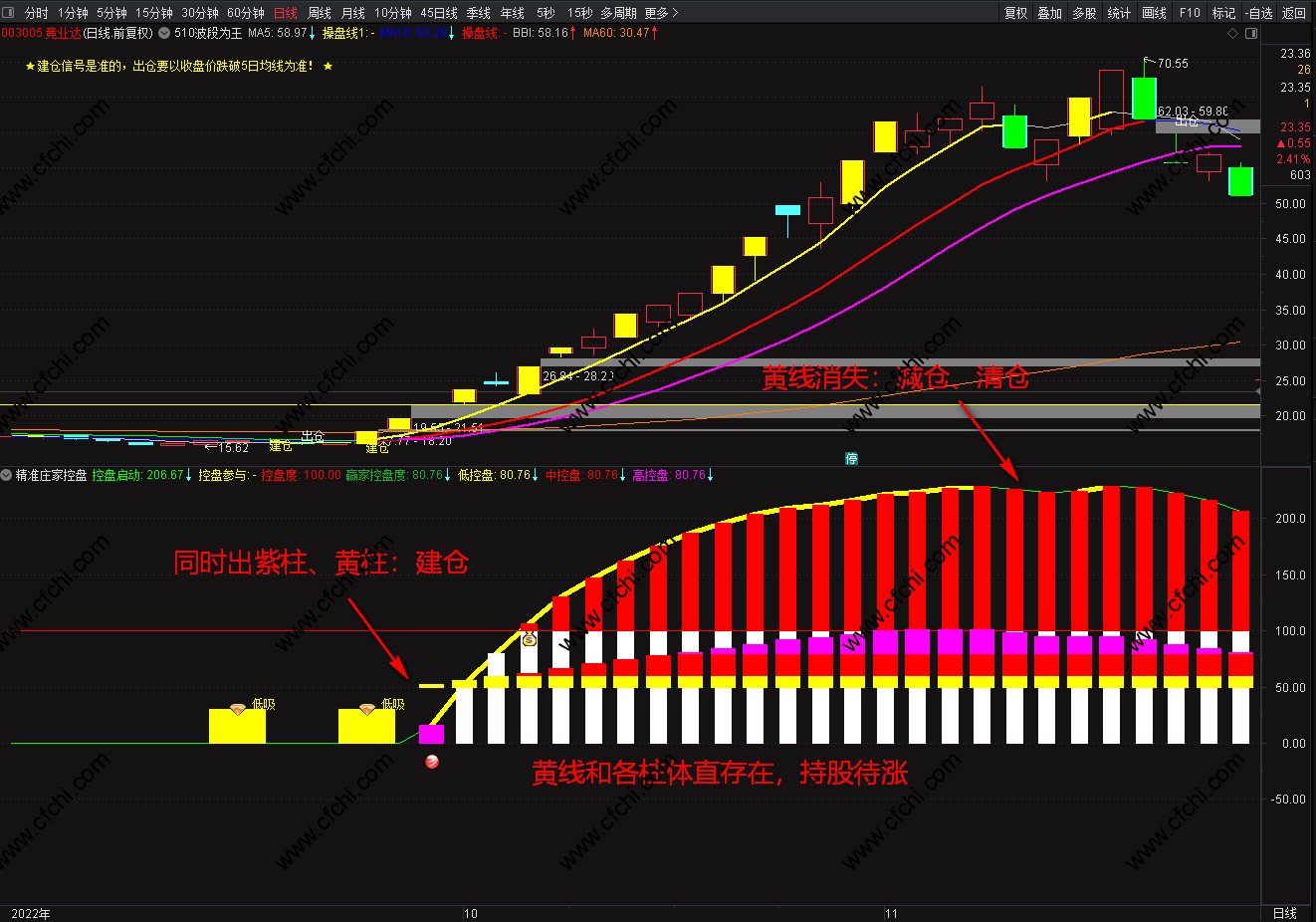2、出现紫柱,黄线,或同时又出现黄柱,可建仓;