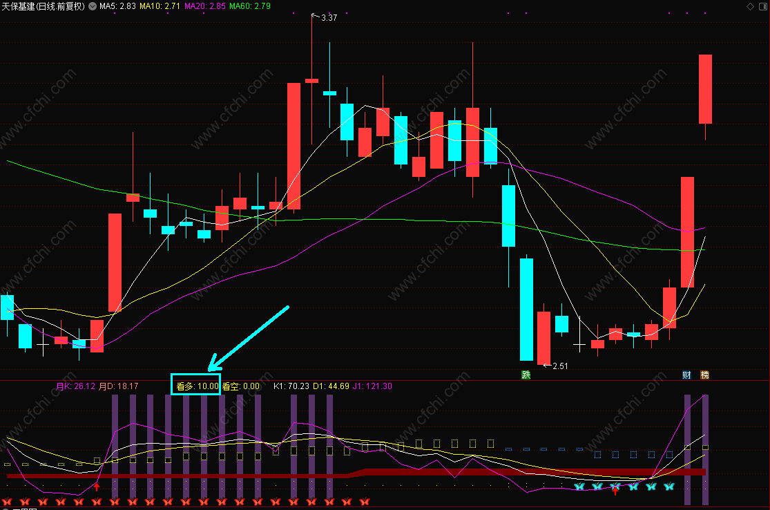 本公式是关于KD指标日、周、月共振的,有一定的参考作用,很多个股主升浪时看多都是显示10分(如图3)。