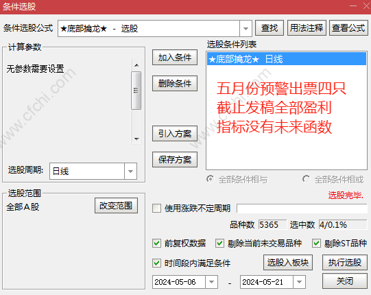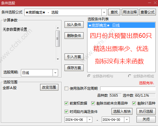 财富池指标公式网(www.cfchi.com)提醒您:指标公式是通过数学逻辑角度编写而来,仅是股票分析环节中的一个辅助工具,对股票选股效率和分析便捷上起到一定的作用,股市是具有不确定性和不可预测性的,请正常对待和使用指标公式!