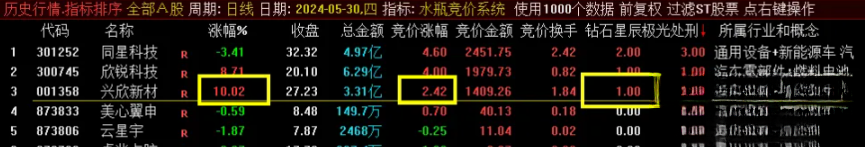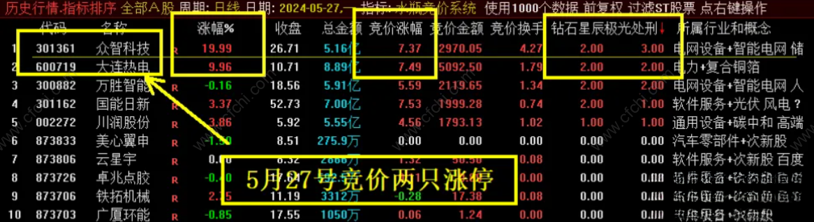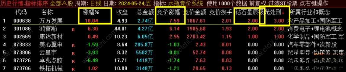 4、操作的个股,看钻石星辰和极光处刑里面的信号,取数值排名前几位的票进行参考;另外还做了选股指标,可以用竞价时间预警使用