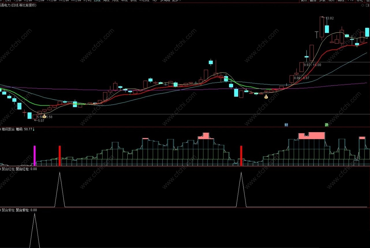 筹码聚合副图、聚合红柱副图及选股、聚合紫柱副图及选股(五合一)。