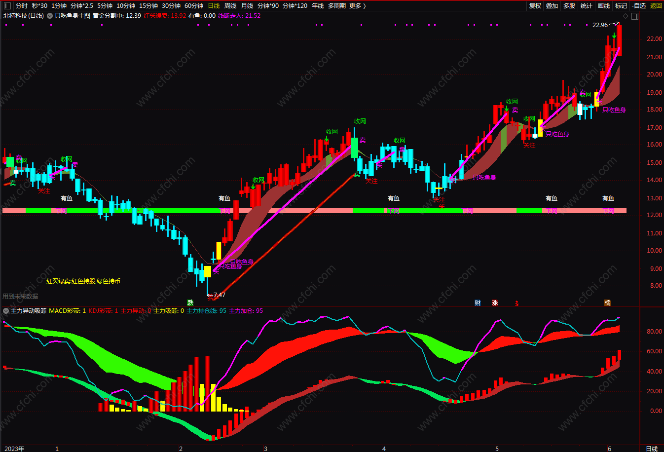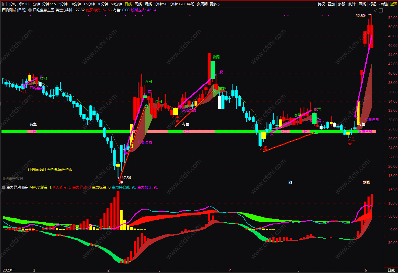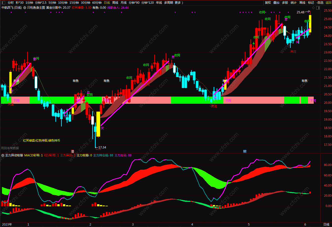 主力异动为红色柱,主力吸筹为黄色柱,主力加仓为洋红色线.
