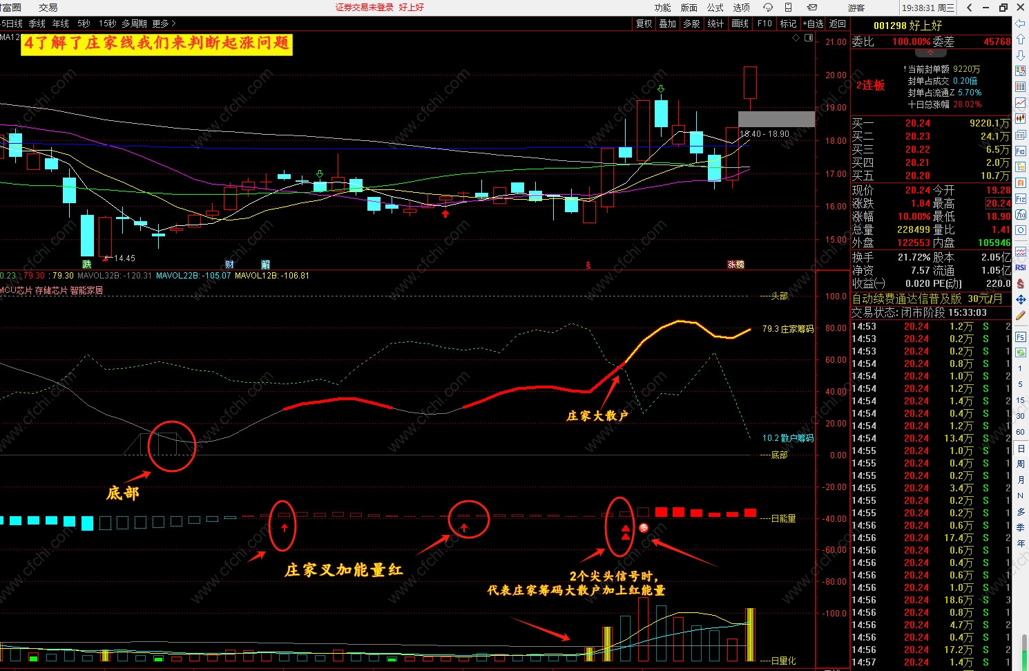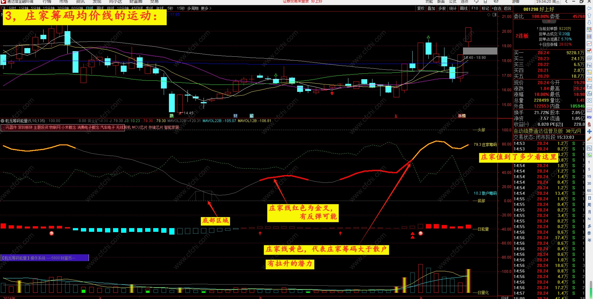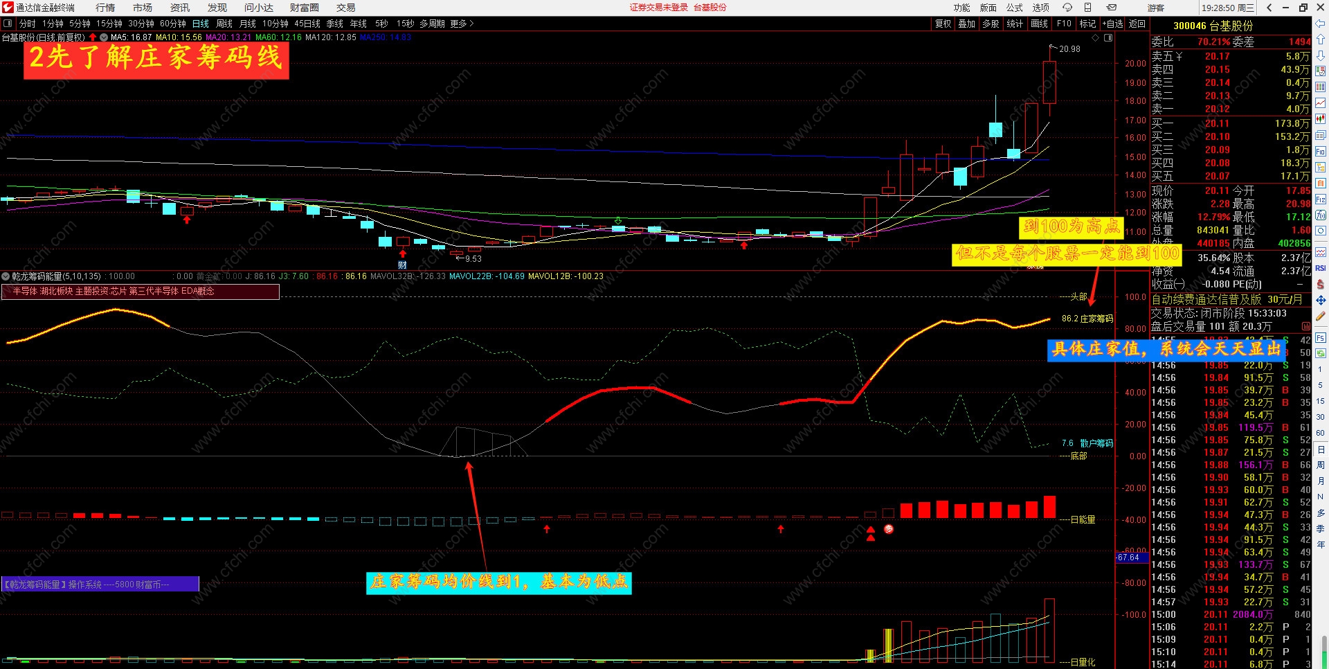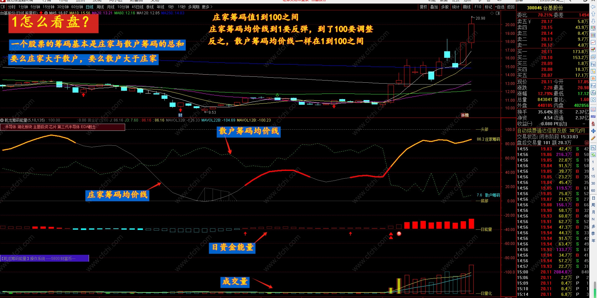 股票要大涨,必须庄家的筹码大于散户,第2,资金能量必须连续进场,第3,必须成交量的放大。短期爆涨,成交量必须超过一年的平均成交量线。掌控了这几点,必成牛股。那么这几个问题,怎么能知道呢?,那就用我们的操作系统。各个条件清晰可见,方法简单。操控可佳。