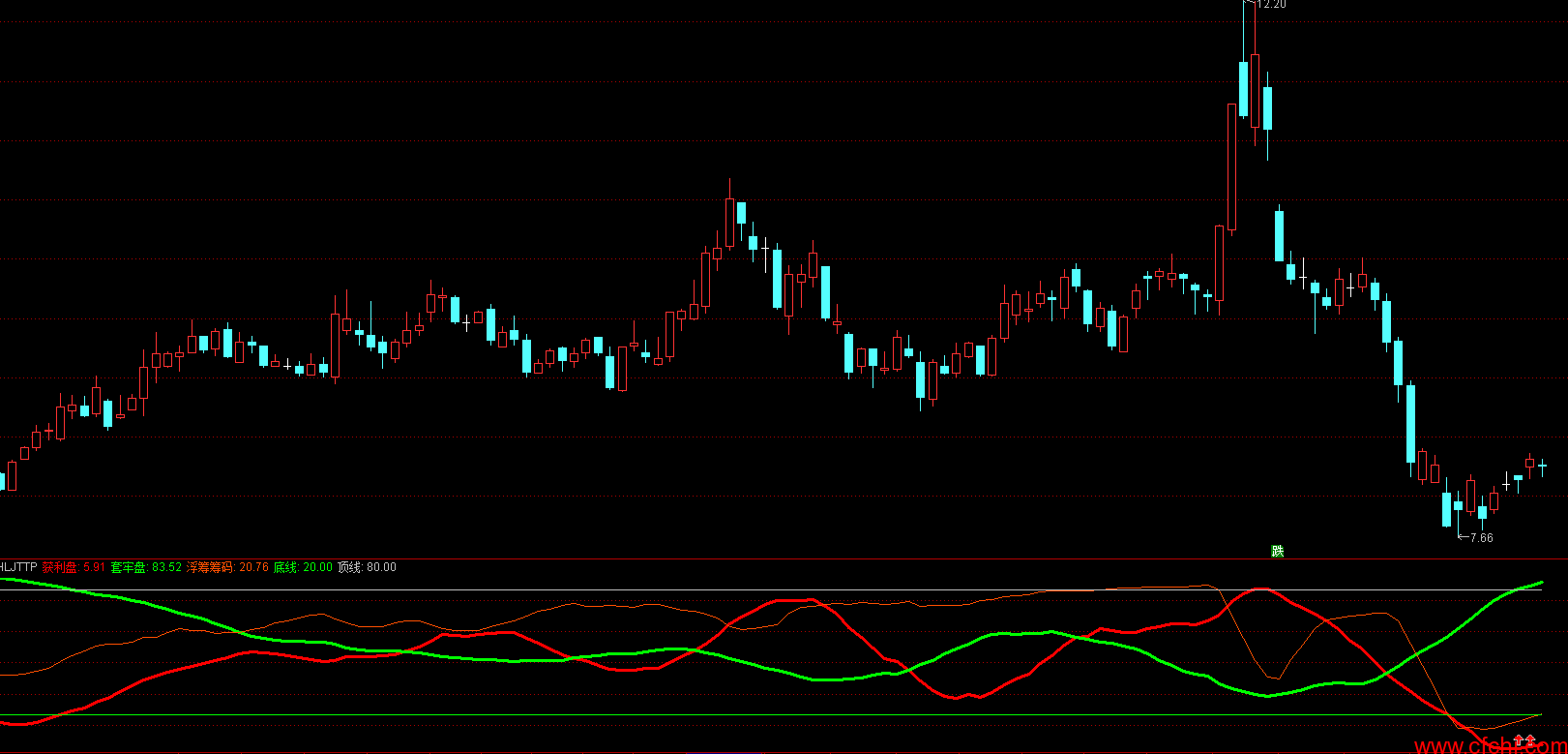 套牢盘:MA(100*(1-WINNER(C)),20),COLORGREEN,LINETHICK3;