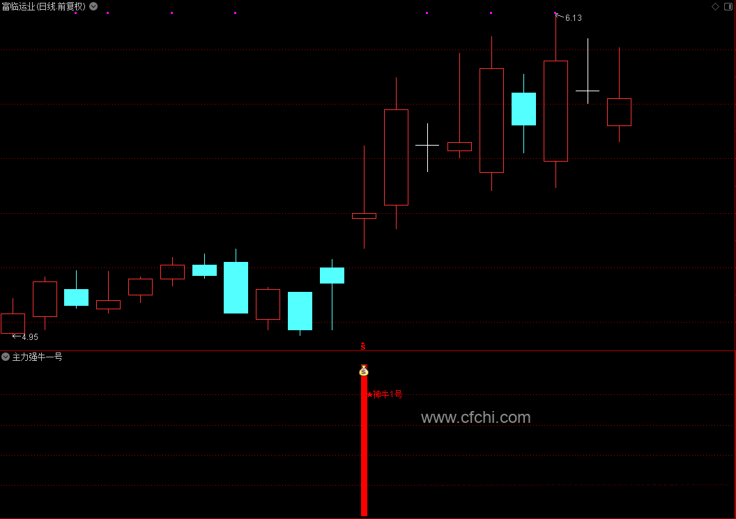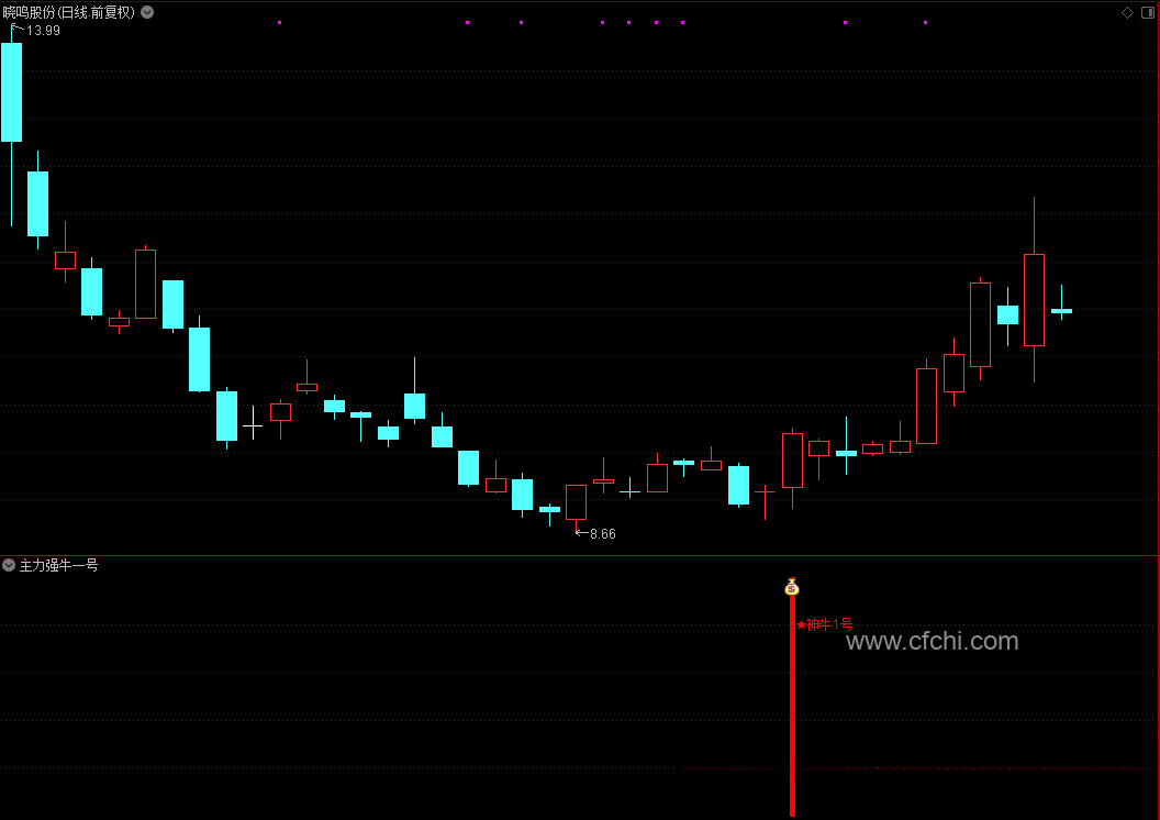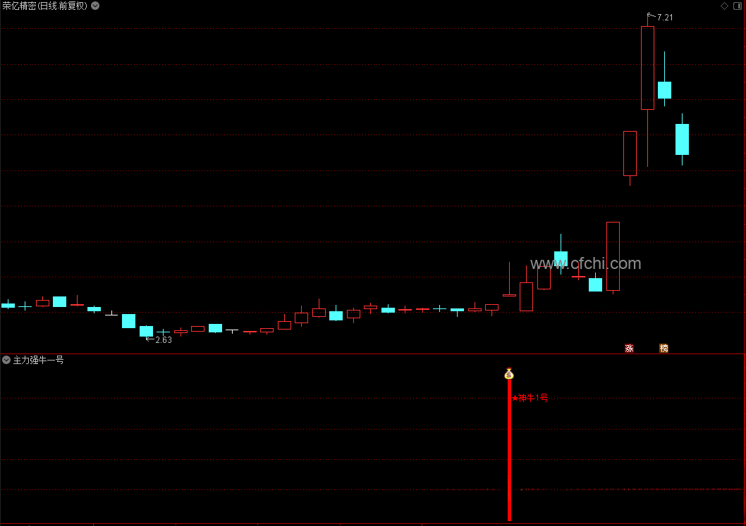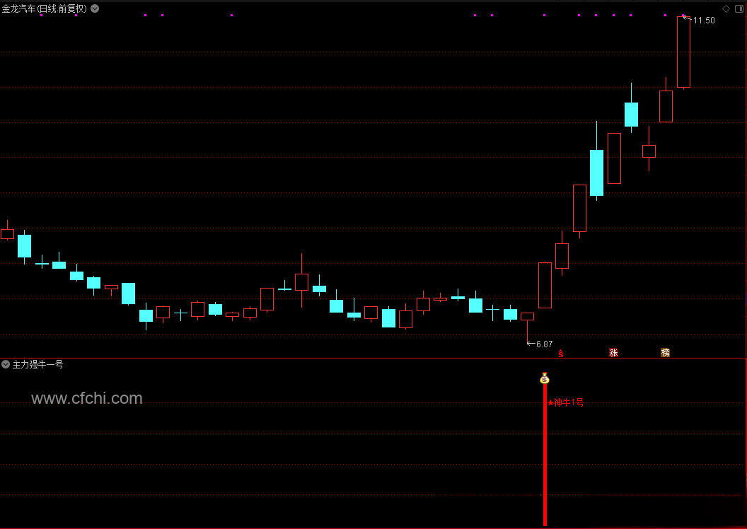 以强势上涨为目的的“强牛1号”公式,多以大阳或涨停板出现,