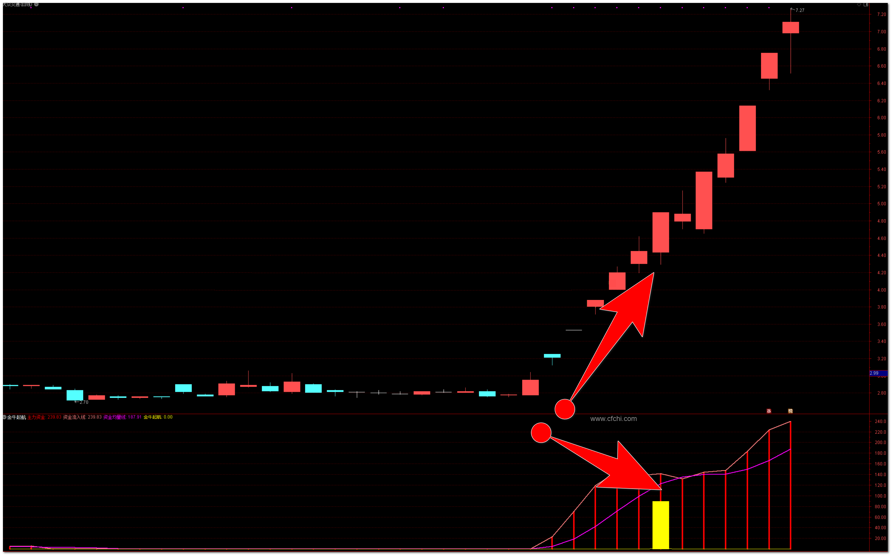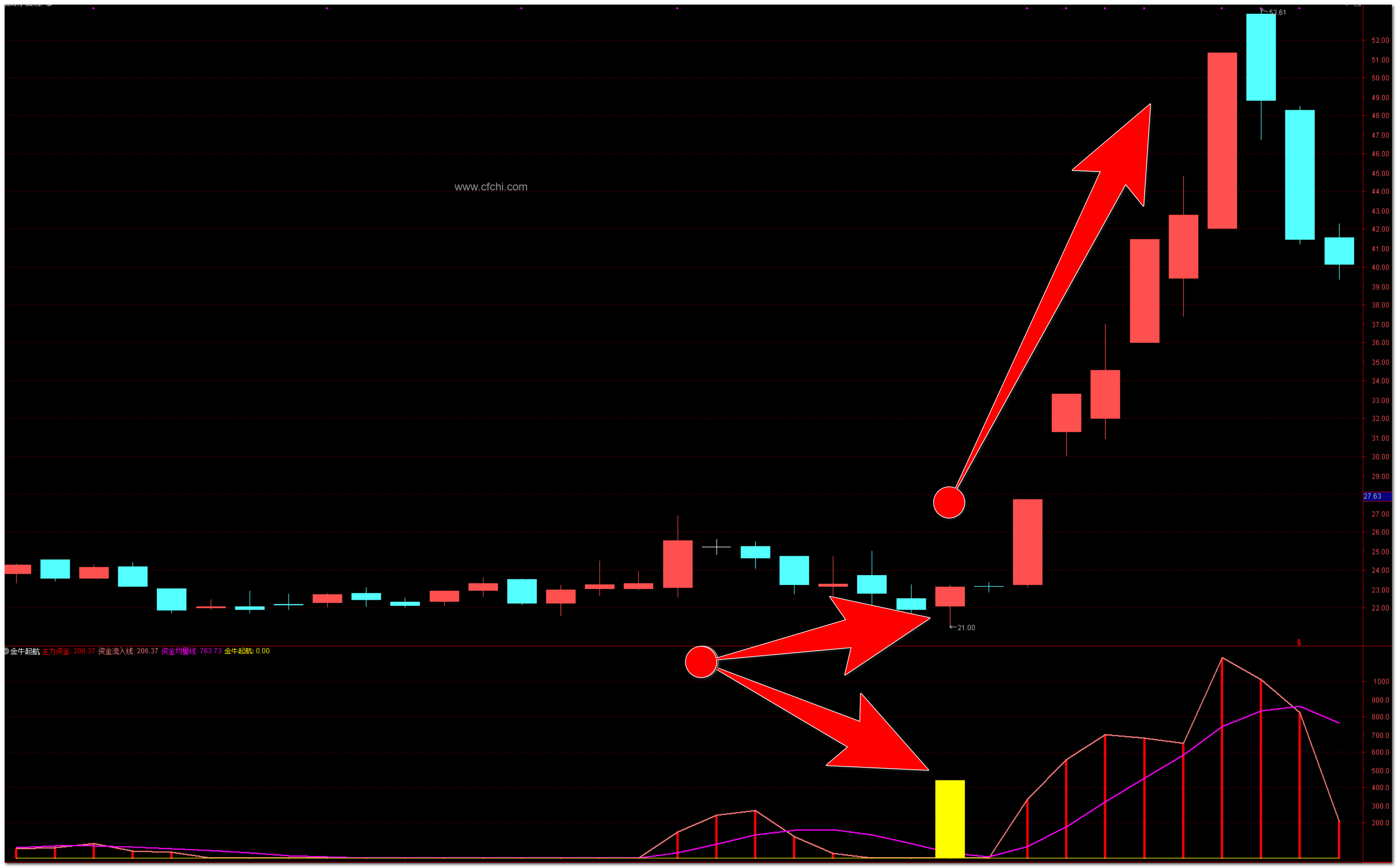 识别金牛起航信号: 当图中出现黄色的“金牛起航”信号时,表示龙头股即将启动,是一个强烈的买入信号。可以根据这一信号,及时介入市场。