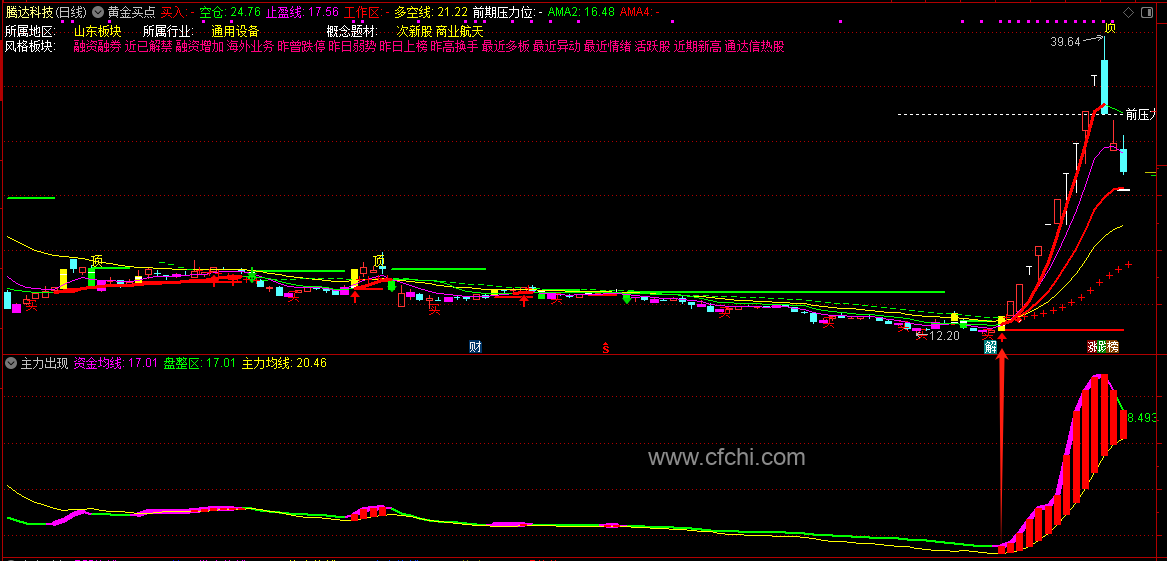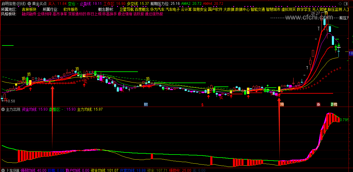 粉红色资金线和主力红色柱子同时出现会组合上涨高潮,再配合个股热点一波大涨就此拉开序幕