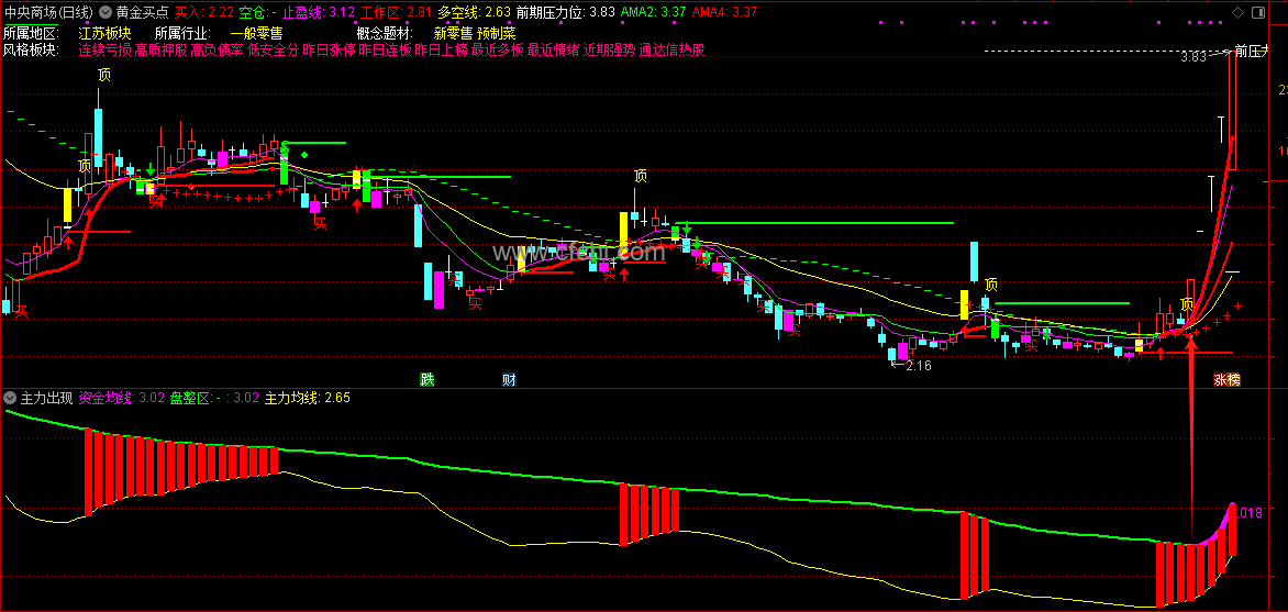 (中央商场这股票也是一只偷偷走牛股票)由于主力红柱出现让我提前在低位就在关注,
