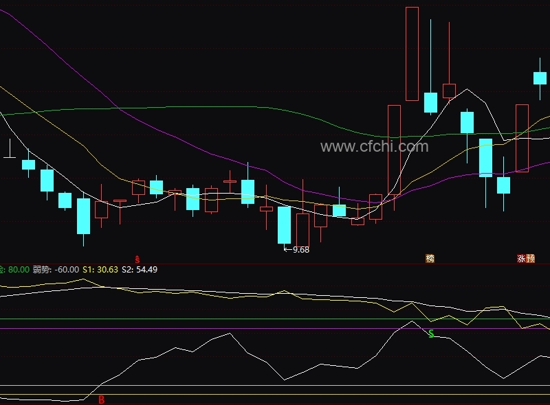 CS:通过计算收盘价在 8 日内的相对波动范围,并将结果映射到 0 到 100 的区间。YJD:对 CS 的 3 日指数移动平均进行处理,以反映价格的趋势。VAR4和VAR5:分别设定了高于和低于收盘价一定比例的价格。VAR6:计算在VAR4和VAR5价格范围内的获利盘比例差值。S1、S2和S3:通过对VAR6的一系列移动平均计算,得到不同周期的平滑结果。YJD上穿极弱且S1>S2;强势上穿YJD且S1<S2。CS的计算:CS = (收盘价 - 8 日内最低价的最低值) / (8 日内最高价的最高值 - 8 日内最低价的最低值) * 100YJD的计算:CS的 3 日指数移动平均,记为EMA3(CS)。YJD = (EMA3(CS) - 50) * 2VAR4和VAR5的计算:VAR4 = (1.1) * 收盘价VAR5 = (0.9) * 收盘价VAR6的计算:VAR6 = 100 * (以 VAR4 计算的获利盘比例 - 以 VAR5 计算的获利盘比例)S1的计算:S1 = 2 * 100 - EMA(VAR6, 1)S2的计算:S2 = EMA(S1, 9)S3的计算:S3 = MA(S2, 9)YJD上穿极弱且S1>S2时,这可能是一个强烈的买入信号。表明价格趋势从极弱开始反转,且获利盘比例相关指标也支持上涨。此时,可以考虑建仓买入。YJD且S1<S2时,这可能暗示上涨趋势即将结束或反转。此时,应考虑减仓或卖出。YJD保持在较高水平且S1>S2的状态持续,可继续持有股票。YJD开始下降,或者S1与S2的关系发生不利变化,应密切关注市场动态,准备调整仓位。郑重声明:股市具有不确定性,个股走势是无法预测的。公式软件描述中的案例截图仅代表过去,仅供参考学习研究之用,不构成投资建议或未来保证,也并不能代表未来,依此操作,责任自负。股市有风险,入市需谨慎。