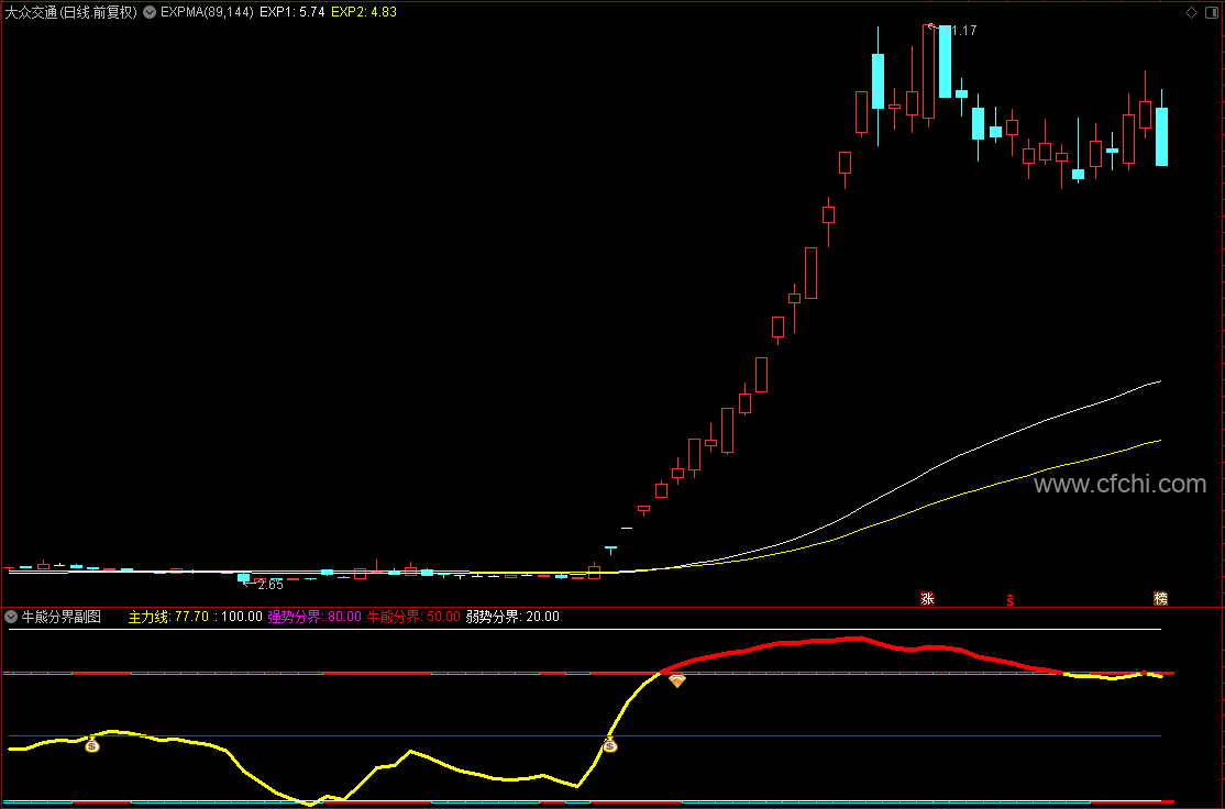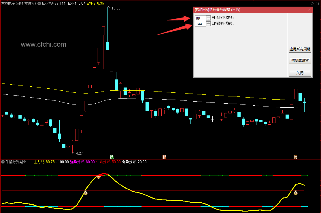 1、主图,使用”神奇的牛熊分界线”(EXPMA89/144),系统自带,直接设置即可。