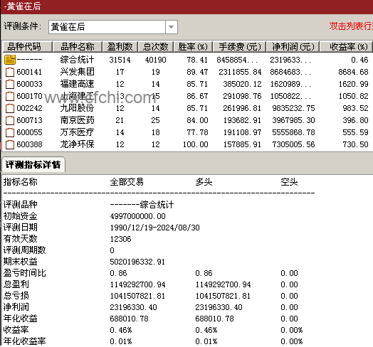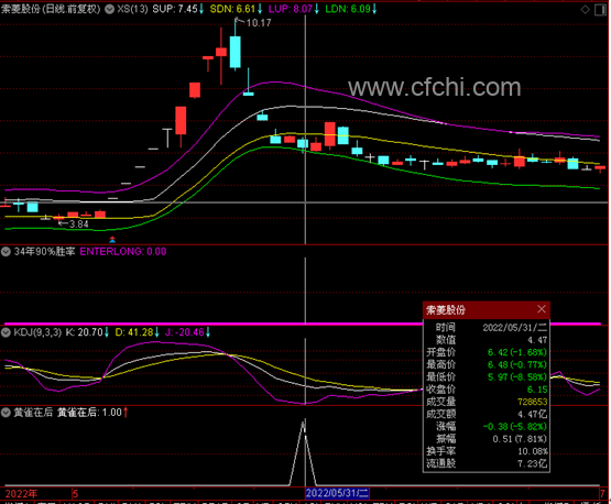 【黄雀在后】指标除了本身信号比较准确1990-2024年34年按10天0.5个点测试胜率78.41%外 (这个胜率只是单纯测试一定时间能股价上涨的概率,不是说利润只有0.5,因为指标重点吃的是向下的利润,实盘越是下跌多的,利润也越高。实盘胜率也远不止78.4%,只是实盘无法量化统计信号后的具体操作数据,34年78.41%胜率本身已经是非常漂亮的测试数据了,但是实盘极少会出信号无脑买),最大的特点就是不拘泥于信号,更看重信号后如何合理操作,要想提高买入胜率,在薛斯通道主图的黄线和绿线之间靠近绿线去买,辅以KDJ指标J值同时见底,此时如再出现标志性K线则确定性进一步提高,另外抄底容易但空间高度难以预测,薛斯通道指标就一定程度上解决了这个问题,四条轨道线可以清晰用来判断股价目前所处位置。价格越是靠近绿线证明越接近股价下跌极限底部。当然跌出绿线的情况也是有的,这时最好不要去买,因为股票一个基本原理就是买的人多卖的人少则股价上涨概率大,反之下跌概率大,所有指标玩的其实都是预测概率,跌破绿线不在正常走势里说明有资金可能在夺路而逃不计成本了,这个时候去买有如去接天上落下的飞刀,很容易受伤,所以价格并不是越低越好,要合理最好。(KDJ,薛斯通道XS两个指标使用通达信软件自带的就可以)