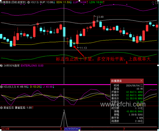603602纵横通信,信号出来不急买,KDJ还未见底,股价尚在薛斯通道黄线之上,说明地板底下可能还有地下室,先让别人帮咱们试刀我们【黄雀在后】,发现标志性十字星有止跌迹象配合KDJ见底,股价在黄线和绿线之间,买入胜率成倍提升。股价跌的越多乖离越大利润也越大。