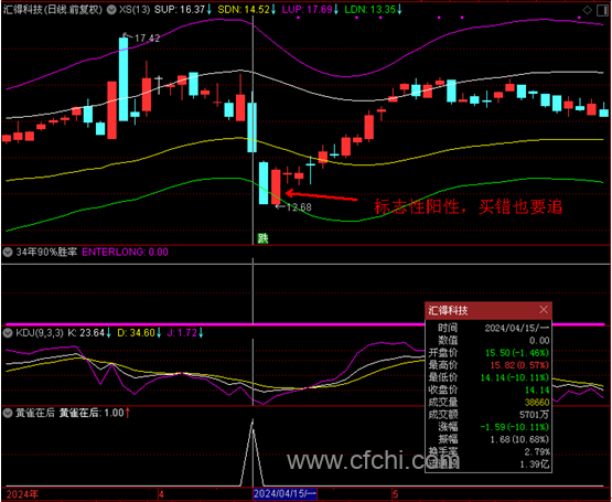 603192汇得科技,信号出来KDJ尚未见底,也未出现止跌K线标志性阳线之类企稳K线,先让别人试刀,我们【黄雀在后】,次日股价打漏绿线KDJ见底,但资金恐慌情绪过大,此时买入无异于接飞刀,需要等止跌,第二天标志性大阳线,市场信心恢复较好,买入更保险,属于买错也要追一下的位置,不容错过。股价跌的越多乖离越大利润也越大。