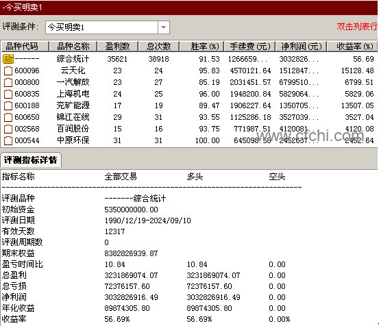 以上为【今买明卖1】34年全部统计结果,胜率为91.53%,总次数38918,。下面我用自己做的程序条件对出信号的所有股票再一次进行统计实际完成一个点的总次数有多少。这是统计源码:真实完成1个点:REF(今买明卖1=1,1)