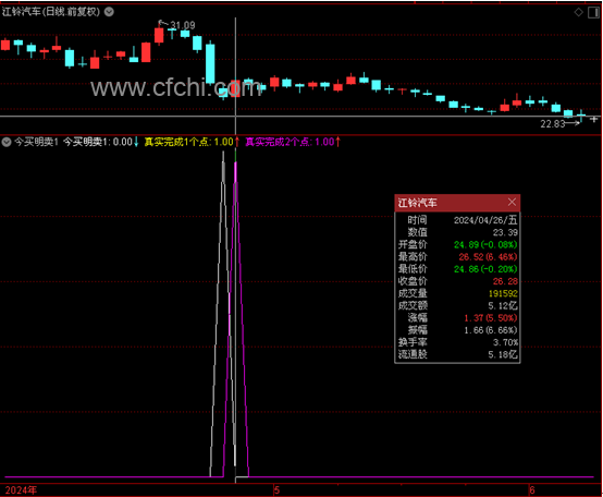 白色信号为今买明卖1的开仓信号,黄色和紫色都是用来测试一个点和两个点完成情况用的,只做测试。可以看出次日最高涨幅有6.46%,很香。因为上面说过实际上有61%的票要大于2个点,如何吃的到要看当天大盘和板块,这部分有运气成分的。4.26号那天大盘是大涨1.17%。这种难得的好环境手里票是可以考虑多看一会吃多一点利润的。