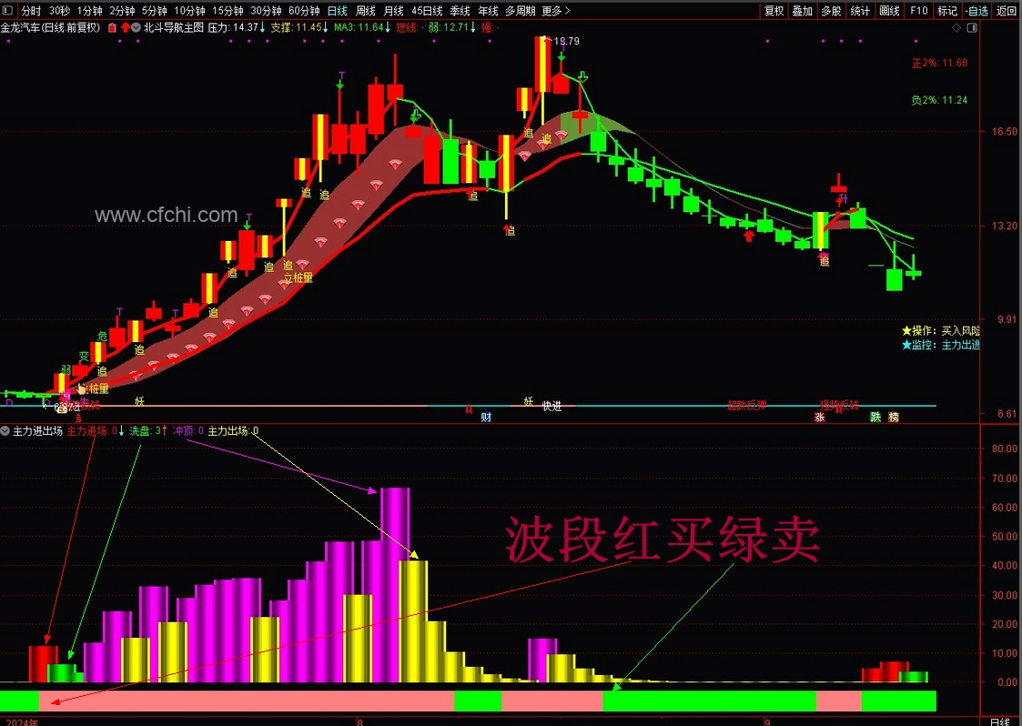 主力进场为红色柱,主力出场为黄色柱,主力洗盘为 绿色 柱,冲顶为洋红色柱.